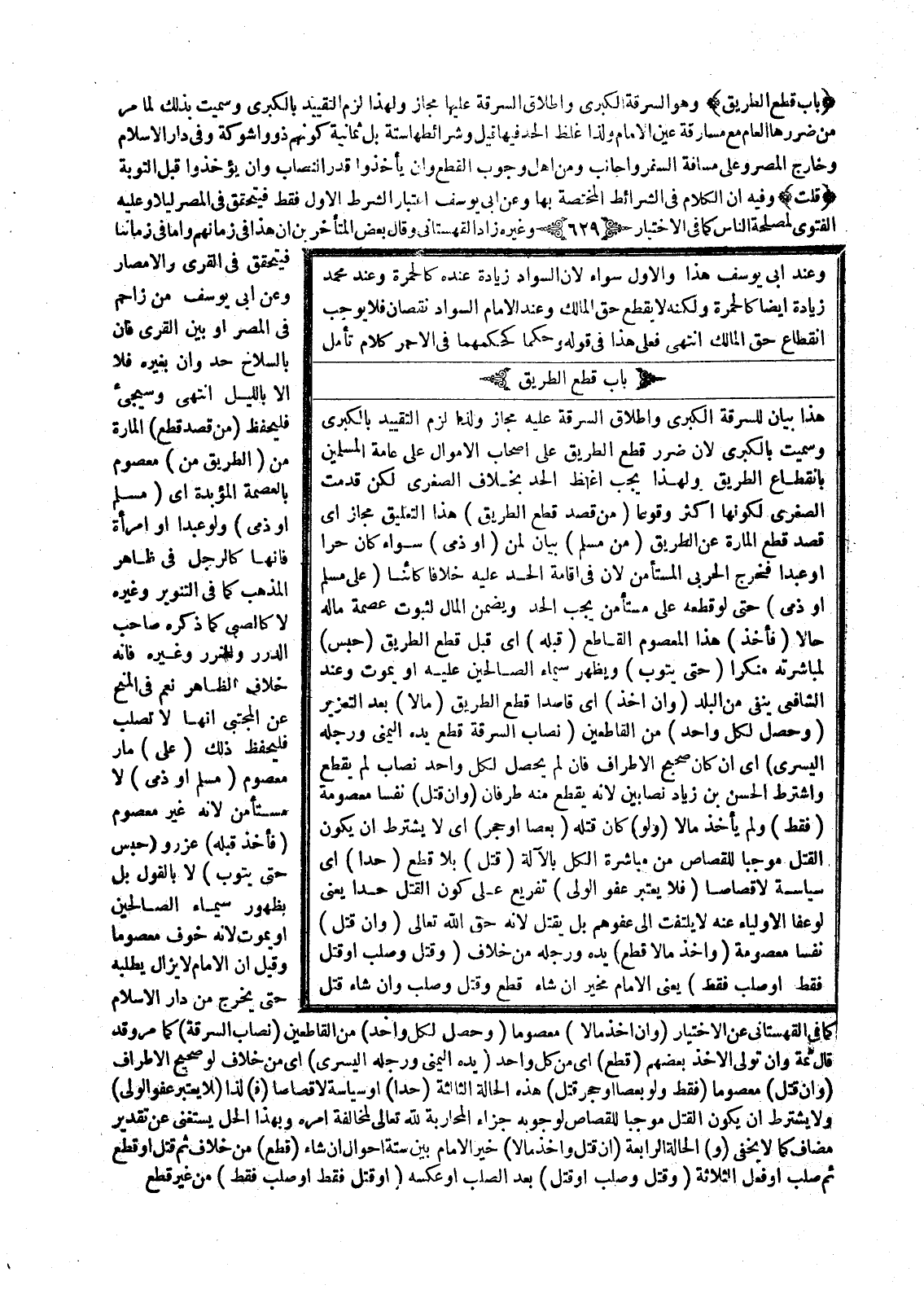 ِ هَذَا بَيَانٌ لِلسَّرِقَةِ الْكُبْرَى وَإِطْلَاقُ السَّرِقَةِ عَلَيْهِ مَجَازٌ؛ وَلِذَا لَزِمَ التَّقْيِيدُ بِالْكُبْرَى وَسُمِّيَتْ بِالْكُبْرَى؛ لِأَنَّ ضَرَرَ قَطْعِ الطَّرِيقِ عَلَى أَصْحَابِ الْأَمْوَالِ عَلَى عَامَّةِ الْمُسْلِمِينَ بِانْقِطَاعِ الطَّرِيقِ؛ وَلِهَذَا يَجِبُ إغْلَاظُ الْحَدِّ بِخِلَافِ الصُّغْرَى لَكِنْ قُدِّمَتْ الصُّغْرَى لِكَوْنِهَا أَكْثَرَ وُقُوعًا (مِنْ قَصْدِ قَطْعِ الطَّرِيقِ) هَذَا التَّعْلِيقُ مَجَازٌ أَيْ: قَصْدُ قَطْعِ الْمَارِّ عَنْ الطَّرِيقِ (مِنْ مُسْلِمٍ) بَيَانٌ لِمَنْ (أَوْ ذِمِّيٍّ) سَوَاءٌ كَانَ حُرًّا، أَوْ عَبْدًا فَخَرَجَ الْحَرْبِيُّ الْمُسْتَأْمَنُ؛ لِأَنَّ فِي إقَامَةِ الْحَدِّ عَلَيْهِ خِلَافًا كَائِنًا (عَلَى مُسْلِمٍ، أَوْ ذِمِّيٍّ) حَتَّى لَوْ قَطَعَهُ عَلَى مُسْتَأْمَنٍ يَجِبُ الْحَدُّ وَيَضْمَنُ الْمَالَ لِثُبُوتِ عِصْمَةِ مَالِهِ حَالًّا (فَأَخَذَ) هَذَا الْمَعْصُومُ الْقَاطِعُ (قَبْلَهُ) أَيْ قَبْلَ قَطْعِ الطَّرِيقِ (حُبِسَ) لِمُبَاشَرَتِهِ مُنْكَرًا (حَتَّى يَتُوبَ) وَيُظْهِرَ سِيمَا الصَّالِحِينَ عَلَيْهِ أَوْ يَمُوتَ وَعِنْدَ الشَّافِعِيِّ يُنْفَى مِنْ الْبَلَدِ.