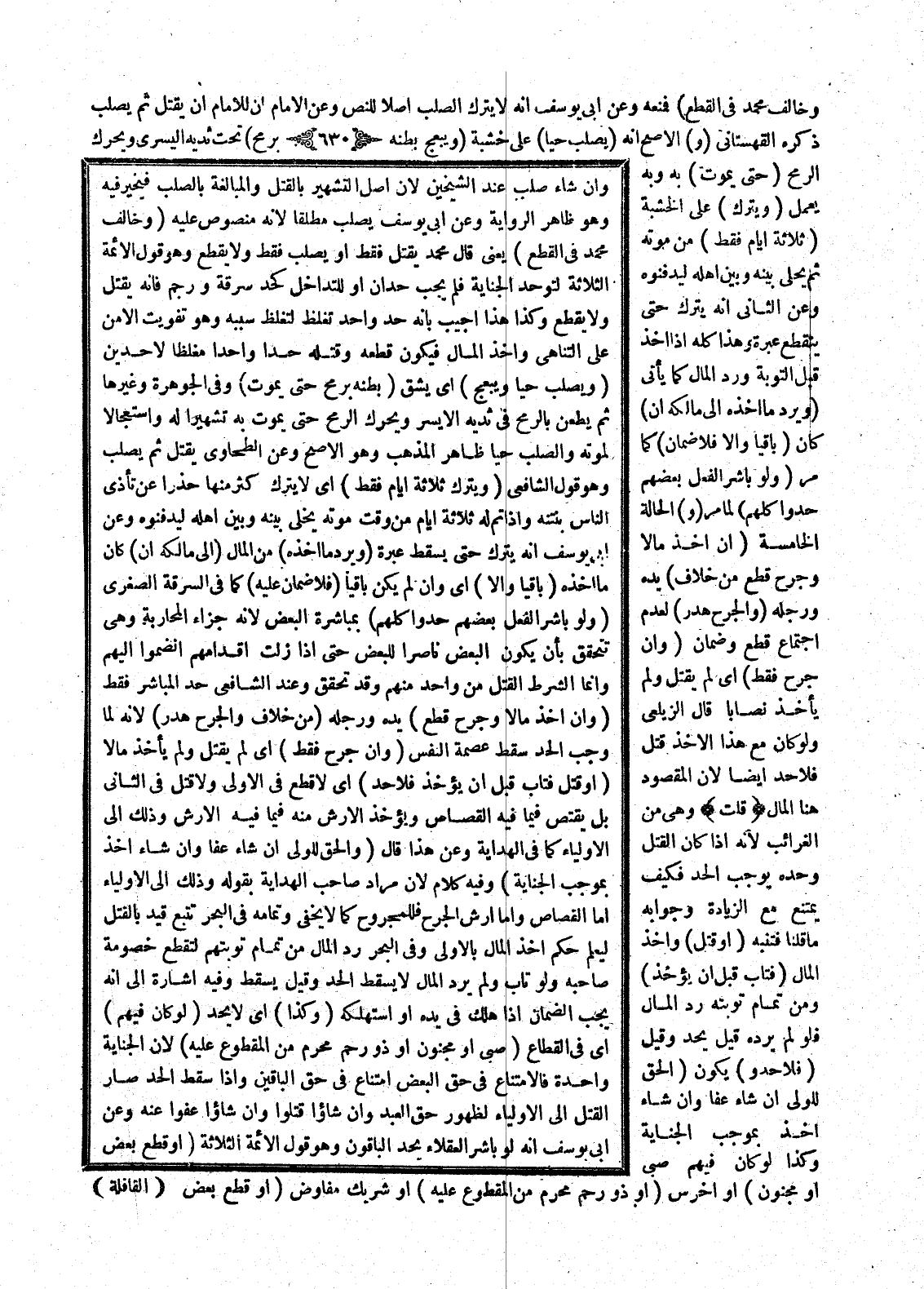 وَعَنْ أَبِي يُوسُفَ يُصْلَبُ مُطْلَقًا؛ لِأَنَّهُ مَنْصُوصٌ عَلَيْهِ (وَخَالَفَ مُحَمَّدٌ فِي الْقَطْعِ) يَعْنِي قَالَ مُحَمَّدٌ يُقْتَلُ فَقَطْ، أَوْ يُصْلَبُ فَقَطْ وَلَا يُقْطَعُ، وَهُوَ قَوْلُ الْأَئِمَّةِ الثَّلَاثَةِ لِتَوَحُّدِ الْجِنَايَةِ فَلَمْ يَجِبْ حَدَّانِ أَوْ لِلتَّدَاخُلِ كَحَدِّ سَرِقَةٍ وَرَجْمٍ فَإِنَّهُ يُقْتَلُ وَلَا يُقْطَعُ، وَكَذَا هَذَا أُجِيبَ بِأَنَّهُ حَدٌّ وَاحِدٌ تَغَلُّظَ لِتَغَلُّظِ سَبَبِهِ، وَهُوَ تَفْوِيتُ الْأَمْنِ عَلَى التَّنَاهِي وَأَخْذُ الْمَالِ فَيَكُونُ قَطْعُهُ وَقَتْلُهُ حَدًّا وَاحِدًا مُغَلَّظًا لَا حَدَّيْنِ (وَيُصْلَبُ حَيًّا وَيُبْعَجُ) أَيْ: يُشَقُّ (بَطْنُهُ بِرُمْحٍ حَتَّى يَمُوتَ) .