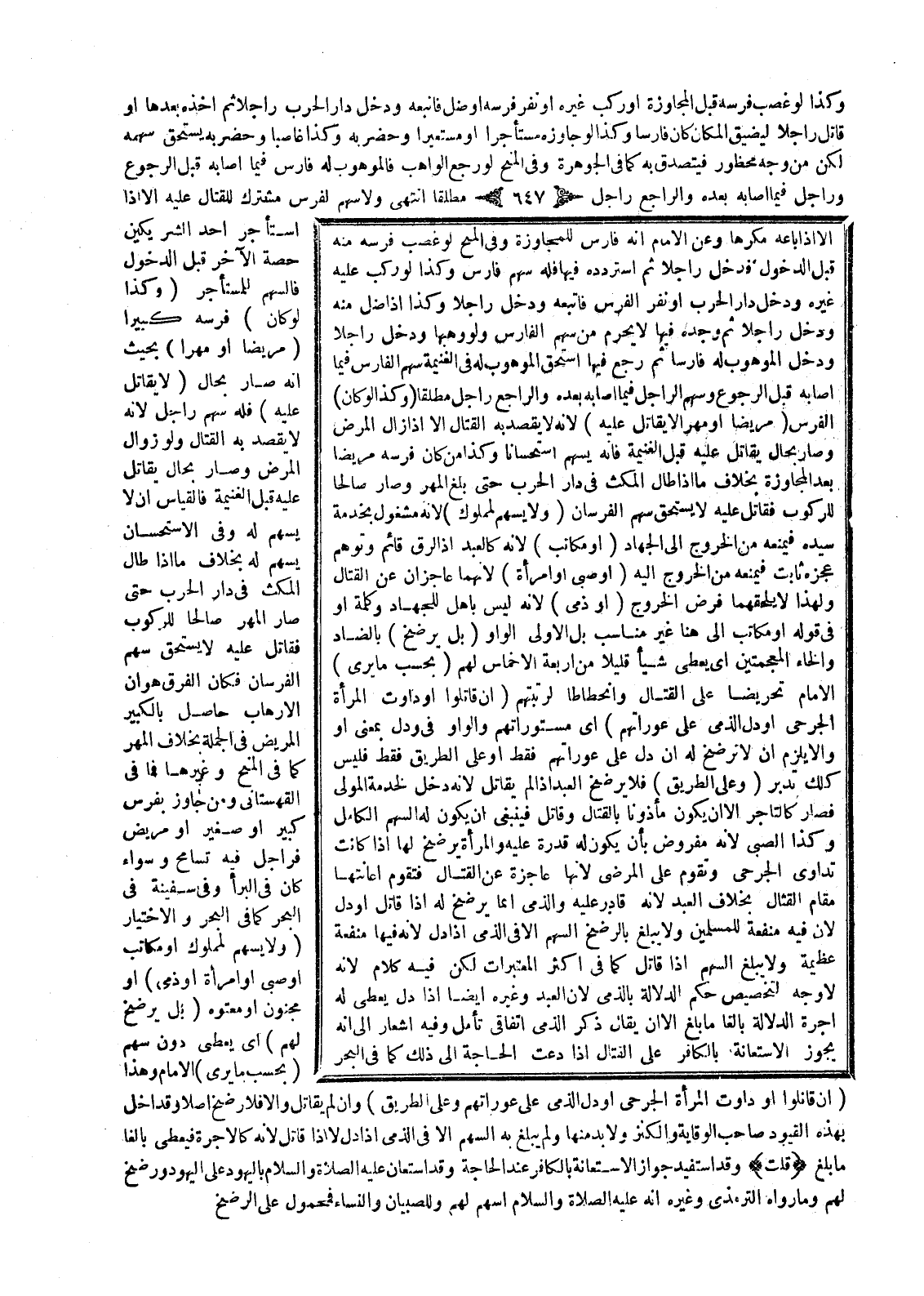 (وَكَذَا لَوْ كَانَ) الْفَرَسُ (مَرِيضًا أَوْ مُهْرًا لَا يُقَاتَلُ عَلَيْهِ) ؛ لِأَنَّهُ لَا يَقْصِدُ بِهِ الْقِتَالَ إلَّا إذَا زَالَ الْمَرَضُ وَصَارَ بِحَالٍ يُقَاتِلُ عَلَيْهِ قَبْلَ الْغَنِيمَةِ فَإِنَّهُ يُسْهَمُ اسْتِحْسَانًا، وَكَذَا مَنْ كَانَ فَرَسُهُ مَرِيضًا بَعْدَ الْمُجَاوَزَةِ بِخِلَافِ مَا إذَا أَطَالَ الْمُكْثَ فِي دَارِ الْحَرْبِ حَتَّى بَلَغَ الْمَهْرُ وَصَارَ صَالِحًا لِلرُّكُوبِ فَقَاتَلَ عَلَيْهِ لَا يَسْتَحِقُّ سَهْمَ الْفُرْسَانِ.