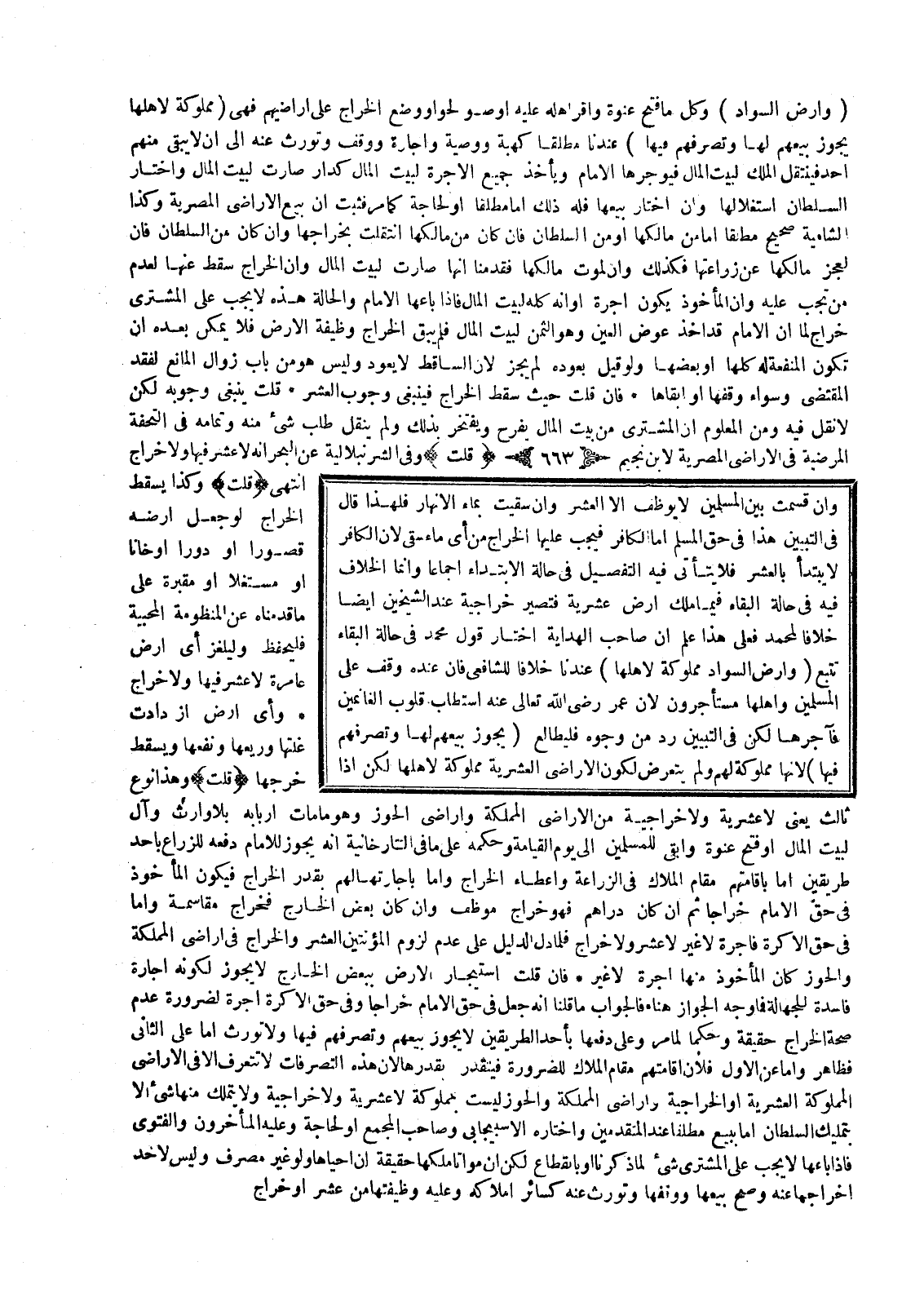 وَإِنْ قُسِمَتْ بَيْنَ الْمُسْلِمِينَ لَا يُوَظِّفُ إلَّا الْعُشْرَ وَإِنْ سُقِيَتْ بِمَاءِ الْأَنْهَارِ فَلِهَذَا قَالَ فِي التَّبْيِينِ هَذَا فِي حَقِّ الْمُسْلِمِ أَمَّا الْكَافِرُ فَيَجِبُ عَلَيْهِ الْخَرَاجُ مِنْ أَيِّ مَاءٍ سَقَى لِأَنَّ الْكَافِرَ لَا يُبْتَدَأُ بِالْعُشْرِ فَلَا يَتَأَتَّى فِيهِ التَّفْصِيلُ فِي حَالَةِ الِابْتِدَاءِ إجْمَاعًا وَإِنَّمَا الْخِلَافُ فِيهِ فِي حَالَةِ الْبَقَاءِ فِيمَنْ مَلَكَ أَرْضًا عُشْرِيَّةً فَتَصِيرُ خَرَاجِيَّةً عِنْدَ الشَّيْخَيْنِ أَيْضًا خِلَافًا لِمُحَمَّدٍ فَعَلَى هَذَا عُلِمَ أَنَّ صَاحِبَ الْهِدَايَةِ اخْتَارَ قَوْلَ مُحَمَّدٍ فِي حَالَةِ الْبَقَاءِ، تَتَبَّعْ. (وَأَرْضُ السَّوَادِ مَمْلُوكَةٌ لِأَهْلِهَا) عِنْدَنَا خِلَافًا لِلشَّافِعِيِّ فَإِنَّهَا عِنْدَهُ وَقْفٌ عَلَى الْمُسْلِمِينَ وَأَهْلُهَا مُسْتَأْجِرُونَ لِأَنَّ عُمَرَ - رَضِيَ اللَّهُ تَعَالَى عَنْهُ - اسْتَطَابَ قُلُوبَ الْغَانِمِينَ فَآجَرَهَا لَكِنْ فِي التَّبْيِينِ رُدَّ مِنْ وُجُوهٍ فَلْيُطَالَعْ (يَجُوزُ بَيْعُهُمْ لَهَا وَتَصَرُّفُهُمْ فِيهَا) لِأَنَّهَا مَمْلُوكَةٌ لَهُمْ وَلَمْ يَتَعَرَّضْ لِكَوْنِ الْأَرَاضِي الْعُشْرِيَّةِ مَمْلُوكَةً لِأَهْلِهَا لَكِنْ إذَا