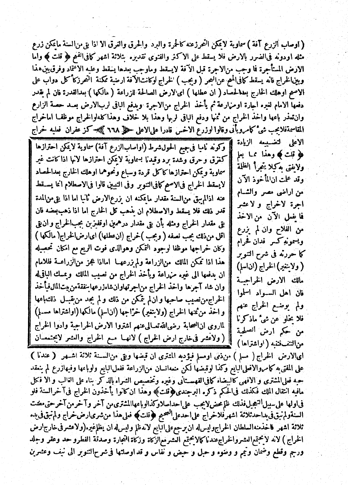 وَفِي التَّبْيِينِ قَالُوا فِي الِاصْطِلَامِ إنَّمَا يَسْقُطُ عَنْهُ إذَا لَمْ يَبْقَ مِنْ السَّنَةِ مِقْدَارُ مَا يُمَكِّنُهُ أَنْ يَزْرَعَ الْأَرْضَ ثَانِيًا أَمَّا إذَا بَقِيَ مِنْ الْمُدَّةِ قَدْرُ ذَلِكَ فَلَا يَسْقُطُ، وَالِاصْطِلَامُ أَنْ يَذْهَبَ كُلُّ الْخَارِجِ أَمَّا إذَا ذَهَبَ بَعْضُهُ فَإِنْ بَقِيَ مِقْدَارُ الْخَرَاجِ وَمِثْلُهُ بِأَنْ بَقِيَ مِقْدَارُ دِرْهَمَيْنِ أَوْ قَفِيزَيْنِ يَجِبُ الْخَرَاجُ وَإِنْ بَقِيَ أَقَلُّ مِنْ ذَلِكَ يَجِبُ نِصْفُهُ (وَيَجِبُ) خَرَاجٌ (إنْ عَطَّلَهَا) أَيْ أَرْضَ الْخَرَاجِ (مَالِكُهَا) وَكَانَ خَرَاجُهَا مُوَظَّفًا لِوُجُودِ التَّمَكُّنِ وَهُوَ الَّذِي فَوَّتَ الرِّيعَ مَعَ إمْكَانِ تَحْصِيلِهِ هَذَا إذَا تَمَكَّنَ الْمَالِكُ مِنْ الزِّرَاعَةِ وَلَمْ يَزْرَعْهَا أَمَّا إذَا عَجَزَ مِنْ الزِّرَاعَةِ فَلِلْإِمَامِ أَنْ يَدْفَعَهَا إلَى غَيْرِهِ مُزَارَعَةً وَيَأْخُذُ الْخَرَاجَ مِنْ نَصِيبِ الْمَالِكِ وَيُمْسِكُ الْبَاقِي لَهُ وَإِنْ شَاءَ آجَرَهَا وَأَخَذَ الْخَرَاجَ مِنْ أُجْرَتِهَا وَإِنْ شَاءَ زَرَعَهَا بِنَفَقَةٍ مِنْ بَيْتِ الْمَالِ فَيَأْخُذُ الْخَرَاجَ مِنْ نَصِيبِ صَاحِبِهَا وَإِنْ لَمْ يَتَمَكَّنْ مِنْ ذَلِكَ وَلَمْ يَجِدْ مَنْ يَقْبَلُ ذَلِكَ بَاعَهَا وَأَخَذَ مِنْ ثَمَنِهَا الْخَرَاجَ (وَلَا يَتَغَيَّرُ) خَرَاجُهَا (إنْ أَسْلَمَ) مَالِكُهَا (أَوْ اشْتَرَاهَا مُسْلِمٌ) لِمَا رُوِيَ أَنَّ الصَّحَابَةَ - رَضِيَ اللَّهُ تَعَالَى عَنْهُمْ - اشْتَرَوْا الْأَرْضَ الْخَرَاجِيَّةَ وَأَدَّوْا الْخَرَاجَ (وَلَا عُشْرَ فِي خَارِجِ أَرْضِ الْخَرَاجِ) لِأَنَّهَا مَعَ الْخَرَاجِ وَالْعُشْرِ لَا يَجْتَمِعَانِ