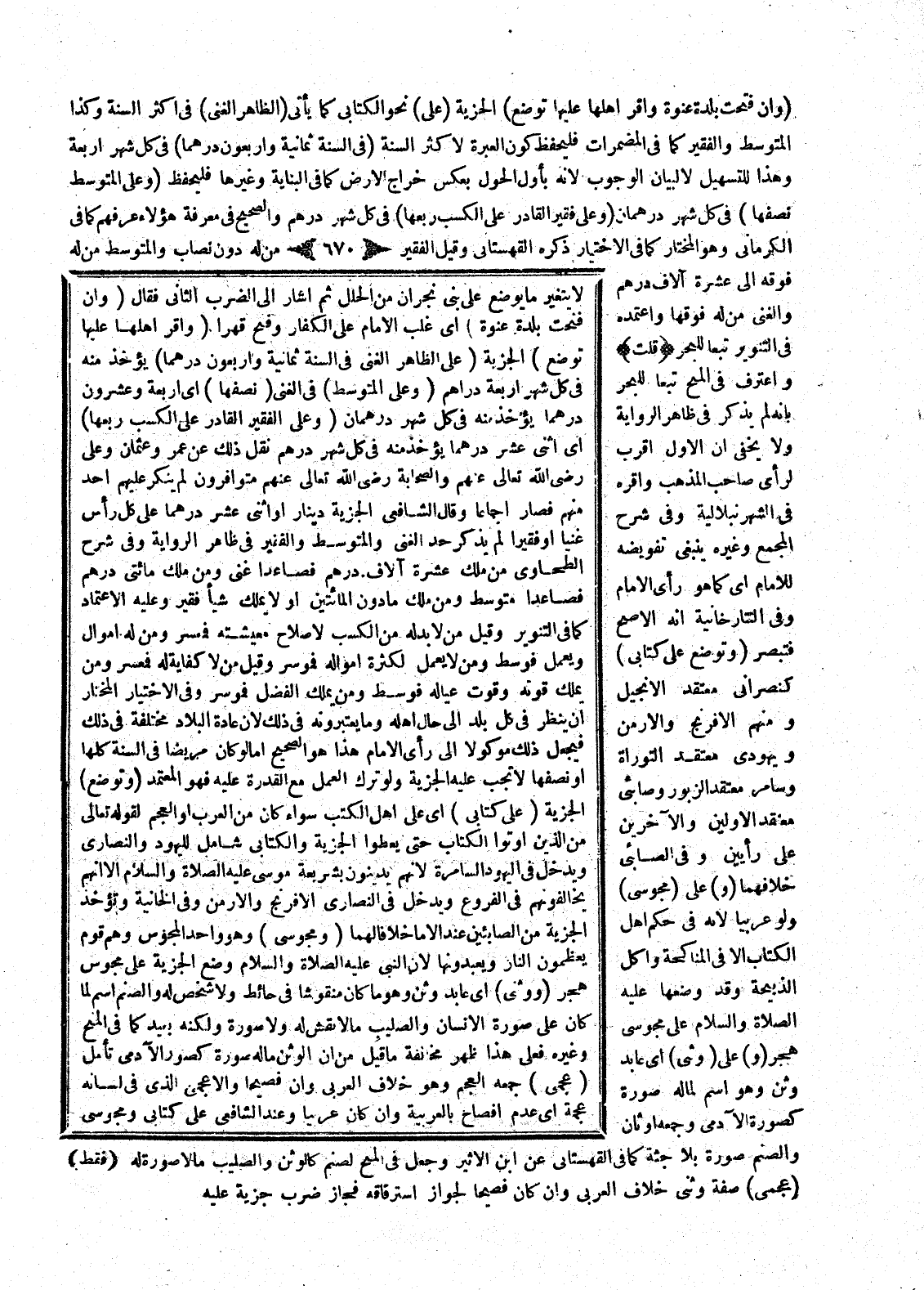 (وَإِنْ فُتِحَتْ بَلْدَةٌ عَنْوَةً) أَيْ غَلَبَ الْإِمَامُ عَلَى الْكُفَّارِ وَفَتَحَ قَهْرًا (وَأَقَرَّ أَهْلَهَا عَلَيْهَا تُوضَعُ) الْجِزْيَةُ (عَلَى الظَّاهِرِ الْغِنَى فِي السَّنَةِ ثَمَانِيَةٌ وَأَرْبَعُونَ دِرْهَمًا) يُؤْخَذُ مِنْهُ فِي كُلِّ شَهْرٍ أَرْبَعَةُ دَرَاهِمَ (وَعَلَى الْمُتَوَسِّطِ) فِي الْغِنَى (نِصْفُهَا) أَيْ أَرْبَعَةٌ وَعِشْرُونَ دِرْهَمًا يُؤْخَذُ مِنْهُ فِي كُلِّ شَهْرٍ دِرْهَمَانِ (وَعَلَى الْفَقِيرِ الْقَادِرِ عَلَى الْكَسْبِ رُبْعُهَا) أَيْ اثْنَيْ عَشَرَ دِرْهَمًا يُؤْخَذُ مِنْهُ فِي كُلِّ شَهْرٍ دِرْهَمٌ نُقِلَ ذَلِكَ عَنْ عُمَرَ وَعُثْمَانَ وَعَلِيٍّ - رَضِيَ اللَّهُ تَعَالَى عَنْهُمْ - وَالصَّحَابَةُ - رَضِيَ اللَّهُ تَعَالَى عَنْهُمْ - مُتَوَافِرُونَ لَمْ يُنْكِرْ عَلَيْهِمْ أَحَدٌ مِنْهُمْ فَصَارَ إجْمَاعًا.