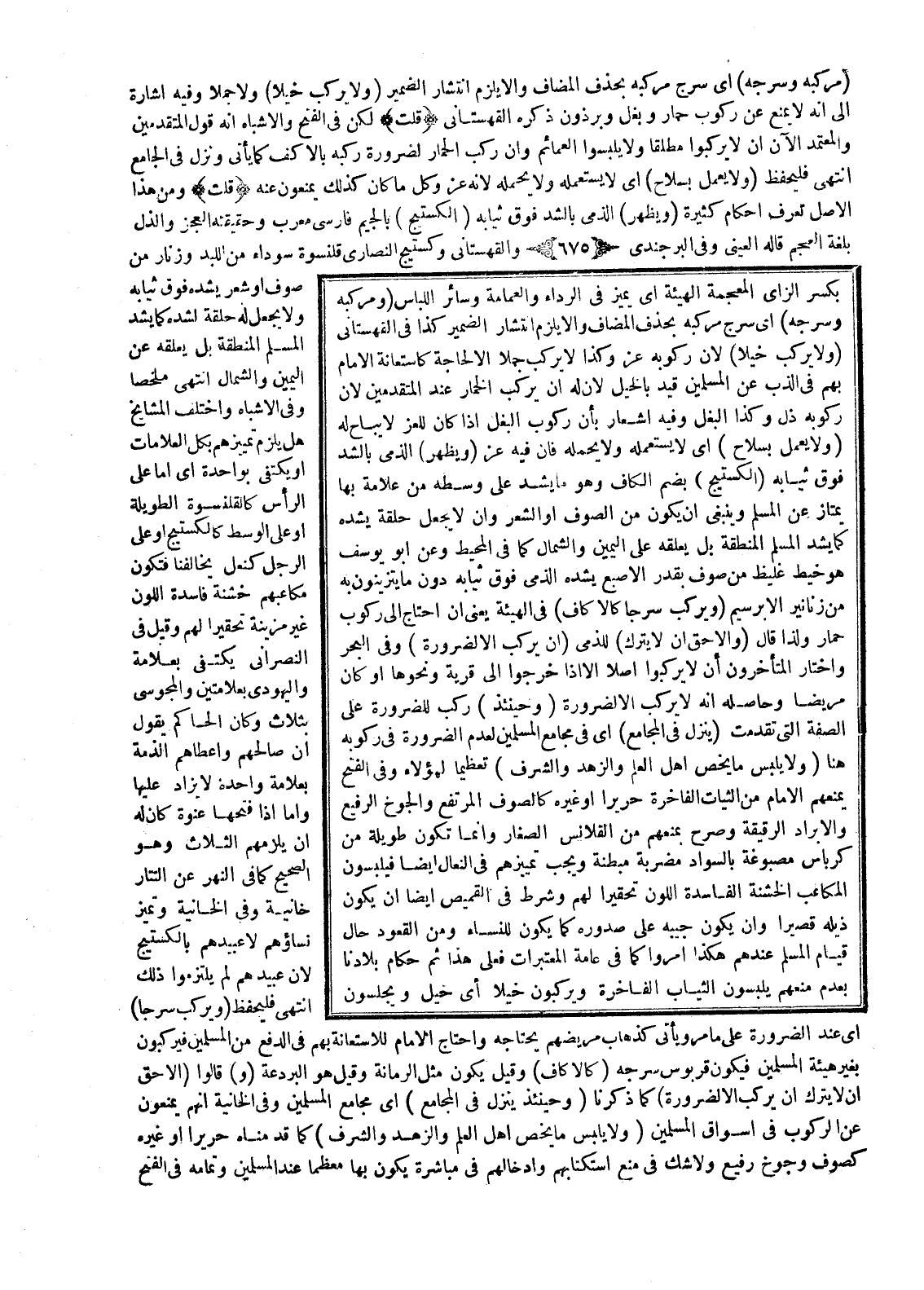 بِكَسْرِ الزَّايِ الْمُعْجَمَةِ الْهَيْئَةُ أَيْ يُمَيَّزُ فِي الرِّدَاءِ وَالْعِمَامَةِ وَسَائِرِ اللِّبَاسِ (وَمَرْكَبِهِ وَسَرْجِهِ) أَيْ سَرْجِ مَرْكَبِهِ بِحَذْفِ الْمُضَافِ وَإِلَّا يَلْزَمُ انْتِشَارُ الضَّمِيرِ كَذَا فِي الْقُهُسْتَانِيِّ (وَلَا يَرْكَبُ خَيْلًا) لِأَنَّ رُكُوبَهُ عِزٌّ وَكَذَا لَا يَرْكَبُ جَمَلًا إلَّا لِحَاجَةٍ كَاسْتِعَانَةِ الْإِمَامِ بِهِمْ فِي الذَّبِّ عَنْ الْمُسْلِمِينَ قَيَّدَ بِالْخَيْلِ لِأَنَّ لَهُ أَنْ يَرْكَبَ الْحِمَارَ عِنْدَ الْمُتَقَدِّمِينَ لِأَنَّ رُكُوبَهُ ذُلٌّ وَكَذَا الْبَغْلُ وَفِيهِ إشْعَارٌ بِأَنَّ رُكُوبَ الْبَغْلِ إذَا كَانَ لِلْعِزِّ لَا يُبَاحُ لَهُ (وَلَا يَعْمَلُ بِسِلَاحٍ) أَيْ لَا يَسْتَعْمِلُهُ وَلَا يَحْمِلُهُ فَإِنَّ فِيهِ عِزًّا (وَيُظْهِرُ) الذِّمِّيُّ بِالشَّدِّ فَوْقَ ثِيَابِهِ (الْكُسْتِيجَ) بِضَمِّ الْكَافِ وَهُوَ مَا يُشَدُّ عَلَى وَسَطِهِ مِنْ عَلَامَةٍ بِهَا يَمْتَازُ عَنْ الْمُسْلِمِ وَيَنْبَغِي أَنْ يَكُونَ مِنْ الصُّوفِ أَوْ الشَّعْرِ وَأَنْ لَا يُجْعَلَ حَلْقَةً يَشُدُّهُ كَمَا يَشُدُّ الْمُسْلِمُ الْمِنْطَقَةَ بَلْ يُعَلِّقُهُ عَلَى الْيَمِينِ وَالشِّمَالِ كَمَا فِي الْمُحِيطِ وَعَنْ أَبُو يُوسُفَ هُوَ خَيْطٌ غَلِيظٌ مِنْ صُوفٍ بِقَدْرِ الْأُصْبُعِ يَشُدُّهُ الذِّمِّيُّ فَوْقَ ثِيَابِهِ دُونَ مَا يَتَزَيَّنُونَ بِهِ مِنْ زَنَانِيرِ الْإِبْرَيْسَمِ (وَيَرْكَبُ سَرْجًا كَالْإِكَافِ) فِي الْهَيْئَةِ يَعْنِي إنْ احْتَاجَ إلَى رُكُوبِ حِمَارٍ وَلِذَا قَالَ (وَالْأَحَقُّ أَنْ لَا يُتْرَكَ) لِلذِّمِّيِّ (أَنْ يَرْكَبَ إلَّا لِضَرُورَةٍ) وَفِي الْبَحْرِ وَاخْتَارَ الْمُتَأَخِّرُونَ أَنْ لَا يَرْكَبُوا أَصْلًا إلَّا إذَا خَرَجُوا إلَى قَرْيَةٍ وَنَحْوِهَا أَوْ كَانَ مَرِيضًا وَحَاصِلُهُ أَنَّهُ لَا يَرْكَبُ إلَّا لِضَرُورَةٍ (وَحِينَئِذٍ) رَكِبَ لِلضَّرُورَةِ عَلَى الصِّفَةِ الَّتِي تَقَدَّمَتْ (يَنْزِلُ فِي الْمَجَامِعِ) أَيْ فِي مَجَامِعِ الْمُسْلِمِينَ لِعَدَمِ الضَّرُورَةِ فِي رُكُوبِهِ هُنَا (وَلَا يَلْبَسُ مَا يَخُصُّ أَهْلَ الْعِلْمِ وَالزُّهْدِ وَالشَّرَفِ) تَعْظِيمًا لِهَؤُلَاءِ.