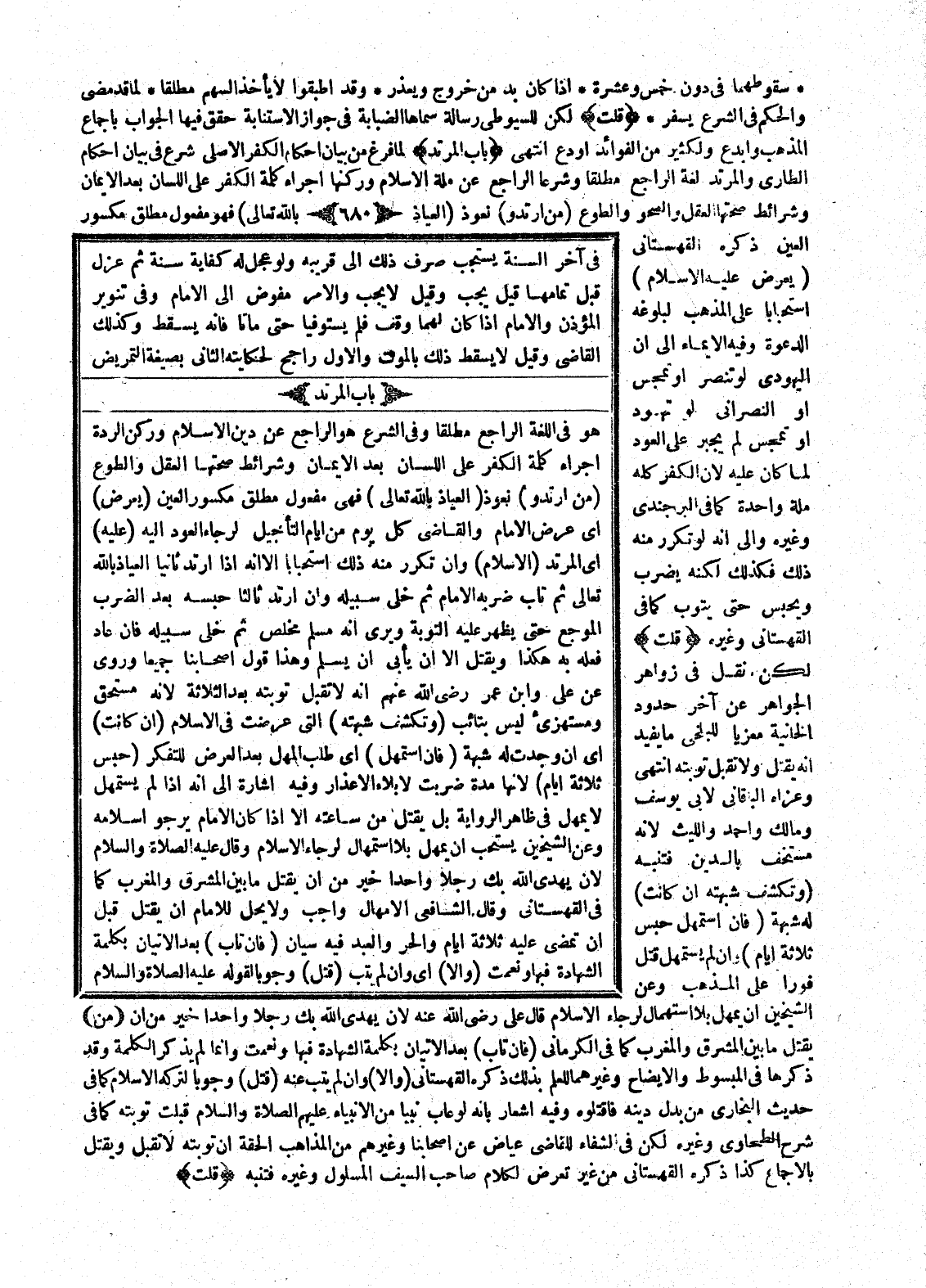 ِّ) هُوَ فِي اللُّغَةِ الرَّاجِعُ مُطْلَقًا وَفِي الشَّرْعِ هُوَ الرَّاجِعُ عَنْ دِينِ الْإِسْلَامِ وَرُكْنُ الرِّدَّةِ إجْرَاءُ كَلِمَةِ الْكُفْرِ عَلَى اللِّسَانِ بَعْدَ الْإِيمَانِ وَشَرَائِطُ صِحَّتِهَا الْعَقْلُ وَالطَّوْعُ (مَنْ ارْتَدَّ وَ) نَعُوذُ (الْعِيَاذَ بِاَللَّهِ تَعَالَى) فَهِيَ مَفْعُولٌ مُطْلَقٌ مَكْسُورُ الْعَيْنِ (يُعْرَضُ) أَيْ عَرَضَ الْإِمَامُ وَالْقَاضِي كُلَّ يَوْمٍ مِنْ أَيَّامِ التَّأْجِيلِ لِرَجَاءِ الْعَوْدِ إلَيْهِ (عَلَيْهِ) أَيْ الْمُرْتَدِّ (الْإِسْلَامُ) وَإِنْ تَكَرَّرَ مِنْهُ ذَلِكَ اسْتِحْبَابًا إلَّا أَنَّهُ إذَا ارْتَدَّ ثَانِيًا الْعِيَاذَ بِاَللَّهِ تَعَالَى ثُمَّ تَابَ ضَرَبَهُ الْإِمَامُ ثُمَّ خَلَّى سَبِيلَهُ وَإِنْ ارْتَدَّ ثَالِثًا حَبَسَهُ بَعْدَ الضَّرْبِ الْمُوجِعِ حَتَّى يَظْهَرَ عَلَيْهِ التَّوْبَةُ وَيَرَى أَنَّهُ مُسْلِمٌ مُخْلِصٌ ثُمَّ خَلَّى سَبِيلَهُ فَإِنْ عَادَ فَعَلَهُ بِهِ هَكَذَا وَيُقْتَلُ إلَّا أَنْ يَأْبَى أَنْ يُسْلِمَ وَهَذَا قَوْلُ أَصْحَابِنَا جَمِيعًا وَرُوِيَ عَنْ عَلِيٍّ وَابْنِ عُمَرَ - رَضِيَ اللَّهُ عَنْهُمْ - أَنَّهُ لَا تُقْبَلُ تَوْبَتُهُ بَعْدَ الثَّلَاثَةِ لِأَنَّهُ مُسْتَحِقٌّ وَمُسْتَهْزِئٌ لَيْسَ بِتَائِبٍ (وَتُكْشَفُ شُبْهَتُهُ) الَّتِي عُرِضَتْ فِي الْإِسْلَامِ (إنْ كَانَتْ) أَيْ إنْ وُجِدَتْ لَهُ شُبْهَةٌ (فَإِنْ اسْتَمْهَلَ) أَيْ طَلَبَ الْمَهْلَ بَعْدَ الْعَرْضِ لِلتَّفَكُّرِ (حُبِسَ ثَلَاثَةَ أَيَّامٍ) لِأَنَّهَا مُدَّةٌ ضُرِبَتْ لِإِبْلَاءِ الْأَعْذَارِ وَفِيهِ إشَارَةٌ إلَى أَنَّهُ إذَا لَمْ يَسْتَمْهِلْ لَا يُمْهَلُ فِي ظَاهِرِ الرِّوَايَةِ بَلْ يُقْتَلُ مِنْ سَاعَتِهِ إلَّا إذَا كَانَ الْإِمَامُ يَرْجُو إسْلَامَهُ.