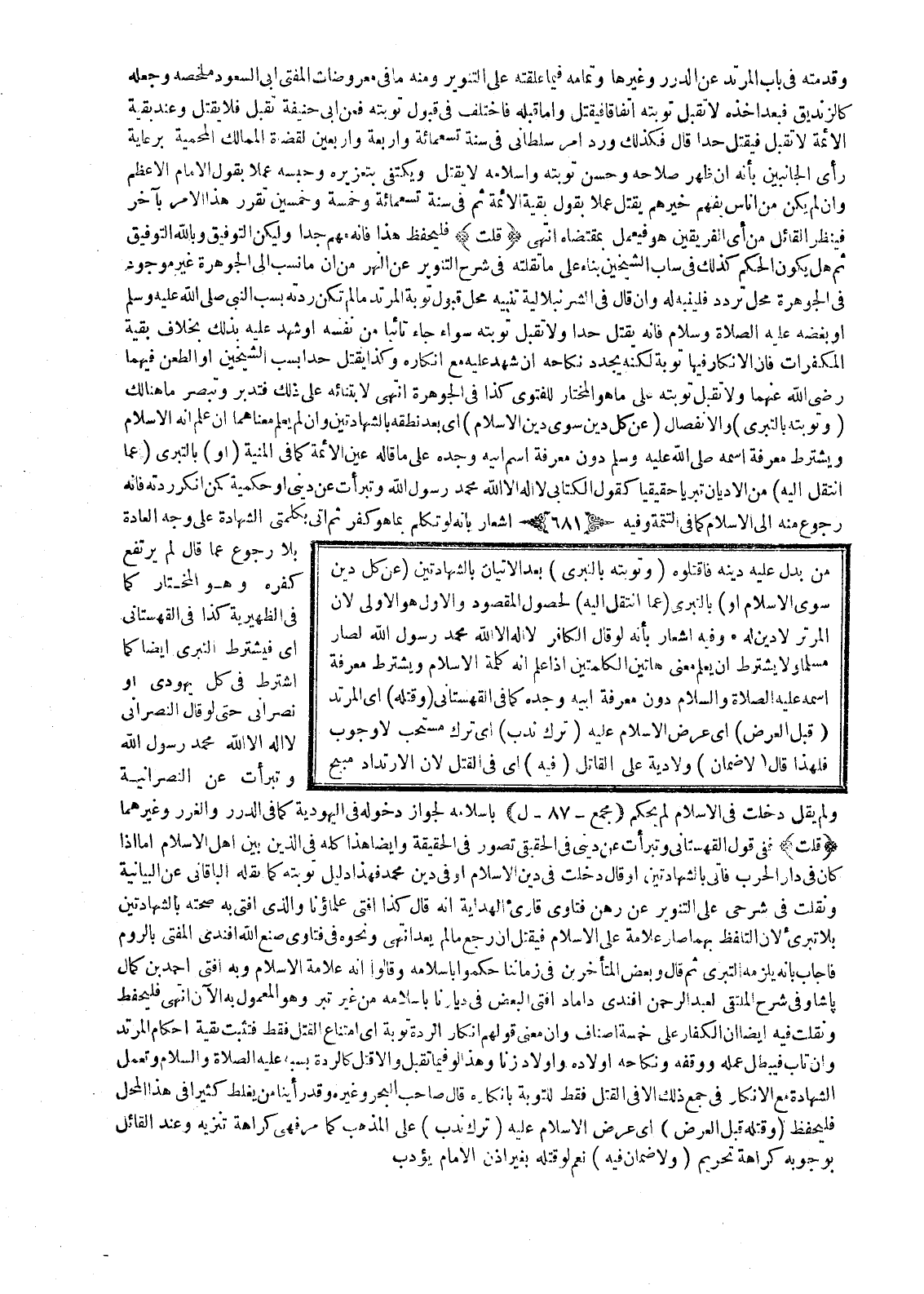 «مَنْ بَدَّلَ دِينَهُ فَاقْتُلُوهُ» (وَتَوْبَتُهُ بِالتَّبَرُّؤِ) بَعْدَ الْإِتْيَانِ بِالشَّهَادَتَيْنِ (عَنْ كُلِّ دِينٍ سِوَى الْإِسْلَامِ أَوْ) بِالتَّبَرِّي (عَمَّا انْتَقَلَ إلَيْهِ) لِحُصُولِ الْمَقْصُودِ وَالْأَوَّلُ هُوَ الْأَوْلَى لِأَنَّ الْمُرْتَدَّ لَا دِينَ لَهُ وَفِيهِ إشْعَارٌ بِأَنَّهُ لَوْ قَالَ الْكَافِرُ لَا إلَهَ إلَّا اللَّهُ مُحَمَّدٌ رَسُولُ اللَّهِ لَصَارَ مُسْلِمًا وَلَا يُشْتَرَطُ أَنْ يَعْلَمَ مَعْنَى هَاتَيْنِ الْكَلِمَتَيْنِ إذَا عَلِمَ أَنَّهُ كَلِمَةُ الْإِسْلَامِ وَيُشْتَرَطُ مَعْرِفَةُ اسْمِهِ - عَلَيْهِ الصَّلَاةُ وَالسَّلَامُ - دُونَ مَعْرِفَةِ أَبِيهِ وَجَدِّهِ كَمَا فِي الْقُهُسْتَانِيِّ.