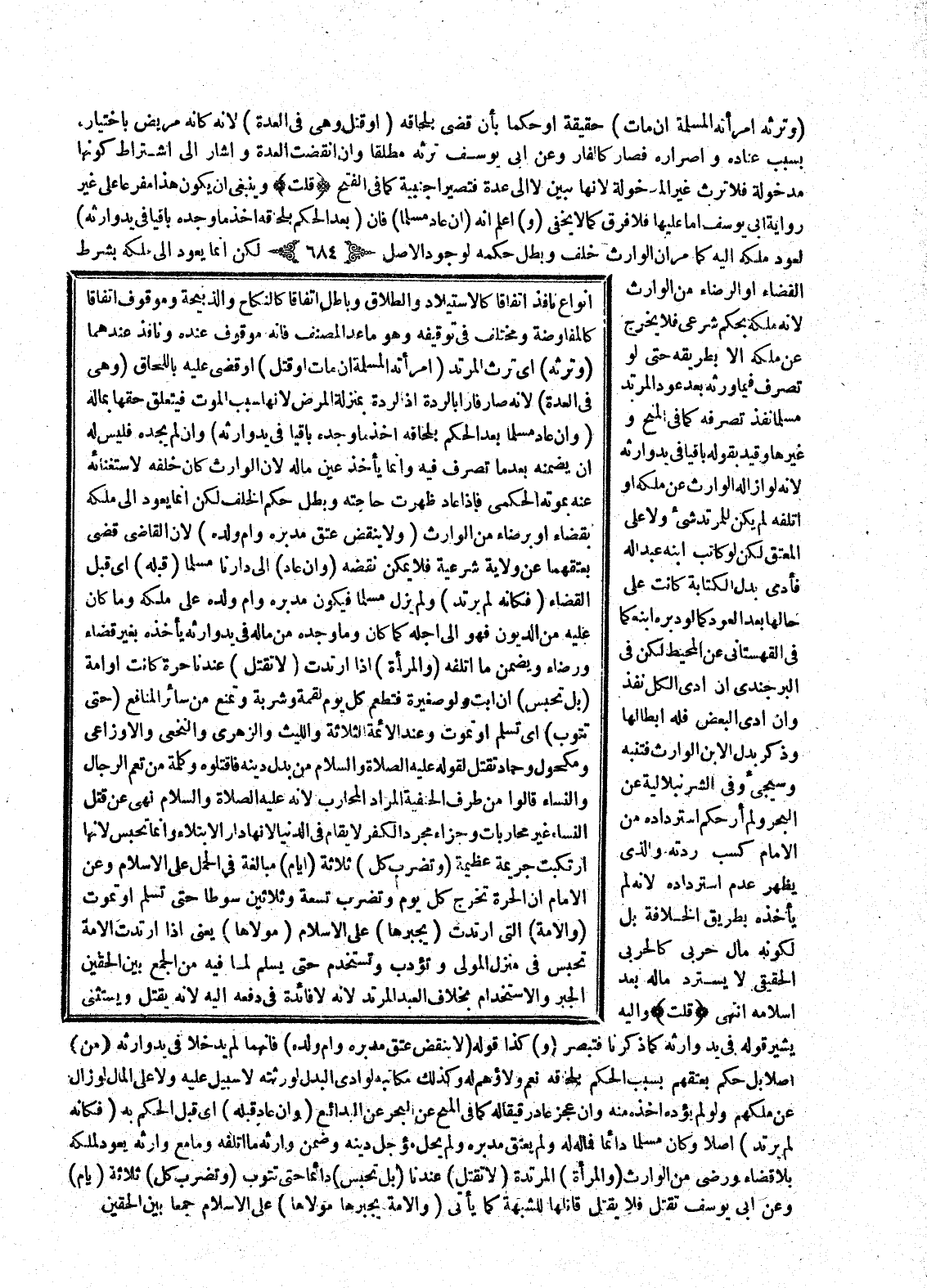 (وَتَرِثُهُ) أَيْ تَرِثُ الْمُرْتَدَّ (امْرَأَتُهُ الْمُسْلِمَةُ إنْ مَاتَ أَوْ قُتِلَ) أَوْ قُضِيَ عَلَيْهِ بِاللِّحَاقِ (وَهِيَ فِي الْعِدَّةِ) لِأَنَّهُ صَارَ فَارًّا بِالرِّدَّةِ إذْ الرِّدَّةُ بِمَنْزِلَةِ الْمَرَضِ لِأَنَّهَا سَبَبُ الْمَوْتِ فَيَتَعَلَّقُ حَقُّهَا بِمَالِهِ.