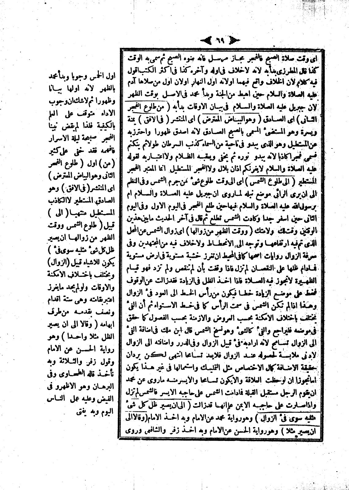 (وَوَقْتُ الظُّهْرِ مِنْ زَوَالِهَا) أَيْ زَوَالِ الشَّمْسِ عَنْ الْمَحَلِّ الَّذِي تَمَّ فِيهِ ارْتِفَاعُهَا، وَتَوَجَّهَ إلَى الِانْحِطَاطِ، وَلَا خِلَافَ فِيهِ مِنْ الْمُجْتَهِدِينَ، وَفِي مَعْرِفَةِ الزَّوَالِ رِوَايَاتٌ أَصَحُّهَا كَمَا فِي الْمُحِيطِ أَنْ تَغْرِزَ خَشَبَةً مُسْتَوِيَةً فِي أَرْضٍ مُسْتَوِيَةٍ فَمَا دَامَ ظِلُّهَا عَلَى النُّقْصَانِ لَمْ تَزُلْ فَإِذَا وَقَفَتْ بِأَنْ لَمْ تَنْقُصْ وَلَمْ تَزِدْ فَهُوَ قِيَامُ الظَّهِيرَةِ لَا تَجُوزُ فِيهِ الصُّورَةُ فَإِذَا أَخَذَ الظِّلُّ فِي الزِّيَادَةِ فَقَدْ زَالَتْ عَنْ الْوُقُوفِ فَخُطَّ عَلَى مَوْضِعِ الزِّيَادَةِ خَطًّا فَيَكُونُ مِنْ رَأْسِ الْخَطِّ إلَى الْعَوْدِ فَيْءُ الزَّوَالِ، وَهَذَا إذَا لَمْ تَكُنْ الشَّمْسُ فِي سَمْتِ الرَّأْسِ كَمَا فِي خَطِّ الِاسْتِوَاءِ ثُمَّ إنَّ الْفَيْءَ يَخْتَلِفُ بِاخْتِلَافِ الْأَمْكِنَةِ بِحَسَبِ الْعُرُوضِ وَالْأَزْمِنَةِ بِحَسَبِ الْفُصُولِ كَمَا حُقِّقَ فِي مَوْضِعِهِ فَلْيُرَاجَعْ، وَالْفَيْءُ كَالشَّيْءِ وَهُوَ نَسْخُ الشَّمْسِ قَالَ ابْنُ مَلِكٍ فِي إضَافَةِ الْفَيْءِ إلَى الزَّوَالِ تَسَامُحٌ؛ لِأَنَّهُ أَرَادَ بِهِ فَيْءَ قُبَيْلِ الزَّوَالِ.