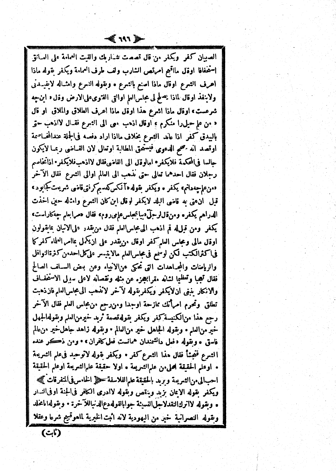 (الْخَامِسُ فِي الْمُتَفَرِّقَاتِ) وَيَكْفُرُ بِقَوْلِهِ الْإِيمَانُ يَزِيدُ وَيَنْقُصُ وَبِقَوْلِهِ لَا أَدْرِي الْكَافِرُ فِي الْجَنَّةِ أَوْ فِي النَّارِ وَبِقَوْلِهِ لَا أَتْرُكُ النَّقْدَ لِأَجْلِ النَّسِيئَةِ جَوَابًا لِقَوْلِهِ دَعْ الدُّنْيَا لِلْآخِرَةِ وَبِقَوْلِهِ أَنَا مُخَلَّدٌ وَبِقَوْلِهِ النَّصْرَانِيَّةُ خَيْرٌ مِنْ الْيَهُودِيَّةِ لِأَنَّهُ أَثْبَتَ الْخَيْرِيَّةَ لِمَا هُوَ قَبِيحٌ شَرْعًا وَعَقْلًا