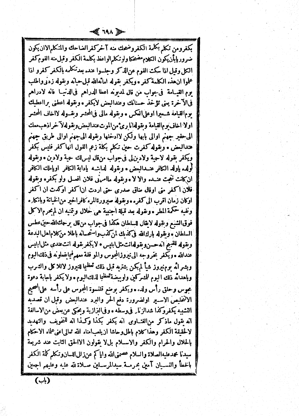 وَفِي الْبَزَّازِيَّةِ وَيُحْكَى عَنْ بَعْضٍ مِنْ الْأَسَالِفَةِ أَنَّهُ يَقُولُ مَا ذُكِرَ مِنْ الْفَتَاوَى أَنَّهُ يَكْفُرُ بِكَذَا وَكَذَا أَنَّهُ لِلتَّخْوِيفِ وَالتَّهْدِيدِ لَا لِحَقِيقَةِ الْكُفْرِ، وَهَذَا كَلَامٌ بَاطِلٌ وَحَاشَا أَنْ يَلْعَبَ أُمَنَاءُ اللَّهِ تَعَالَى أَعْنِي عُلَمَاءَ الْأَحْكَامِ بِالْحَلَالِ وَالْحَرَامِ وَالْكُفْرِ وَالْإِسْلَامِ بَلْ لَا يَقُولُونَ إلَّا الْحَقَّ الثَّابِتَ عِنْدَ شَرِيعَةِ سَيِّدِنَا مُحَمَّدٍ - عَلَيْهِ الصَّلَاةُ وَالسَّلَامُ - عَصَمَنِي اللَّهُ وَإِيَّاكُمْ عَنْ زَلَلٍ عَنْ اللِّسَانِ وَتَكَلُّمِ كَلِمَةِ الْكُفْرِ بِالْخَطَأِ وَالنِّسْيَانِ آمِينَ بِحُرْمَةِ سَيِّدِ الْمُرْسَلِينَ صَلَاةٌ لِلَّهِ عَلَيْهِ وَعَلَيْهِمْ أَجْمَعِينَ.