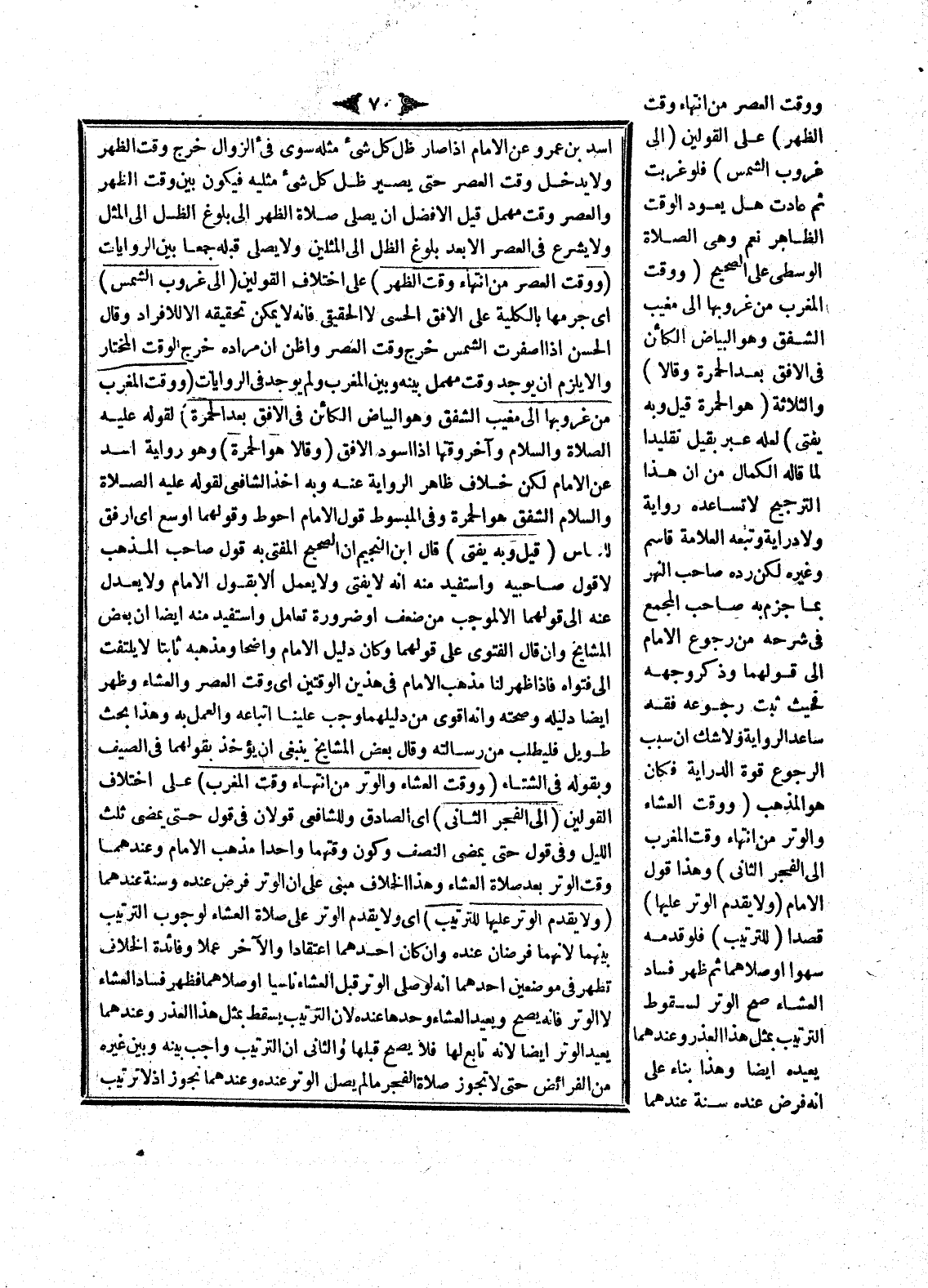 أَسَدُ بْنُ عَمْرٍو عَنْ الْإِمَامِ إذَا صَارَ ظِلُّ كُلِّ شَيْءٍ مِثْلَهُ سِوَى فَيْءِ الزَّوَالِ خَرَجَ وَقْتُ الظُّهْرِ وَلَا يَدْخُلُ وَقْتُ الْعَصْرِ حَتَّى يَصِيرَ ظِلُّ كُلِّ شَيْءٍ مِثْلَيْهِ فَيَكُونُ بَيْنَ وَقْتِ الظُّهْرِ وَالْعَصْرِ وَقْتٌ مُهْمَلٌ قِيلَ الْأَفْضَلُ أَنْ يُصَلِّيَ صَلَاةَ الظُّهْرِ إلَى بُلُوغِ الظِّلِّ إلَى الْمِثْلِ وَلَا يَشْرَعُ فِي الْعَصْرِ إلَّا بَعْدَ بُلُوغِ الظِّلِّ إلَى الْمِثْلَيْنِ وَلَا يُصَلِّي قَبْلَهُ جَمْعًا بَيْنَ الرِّوَايَاتِ.