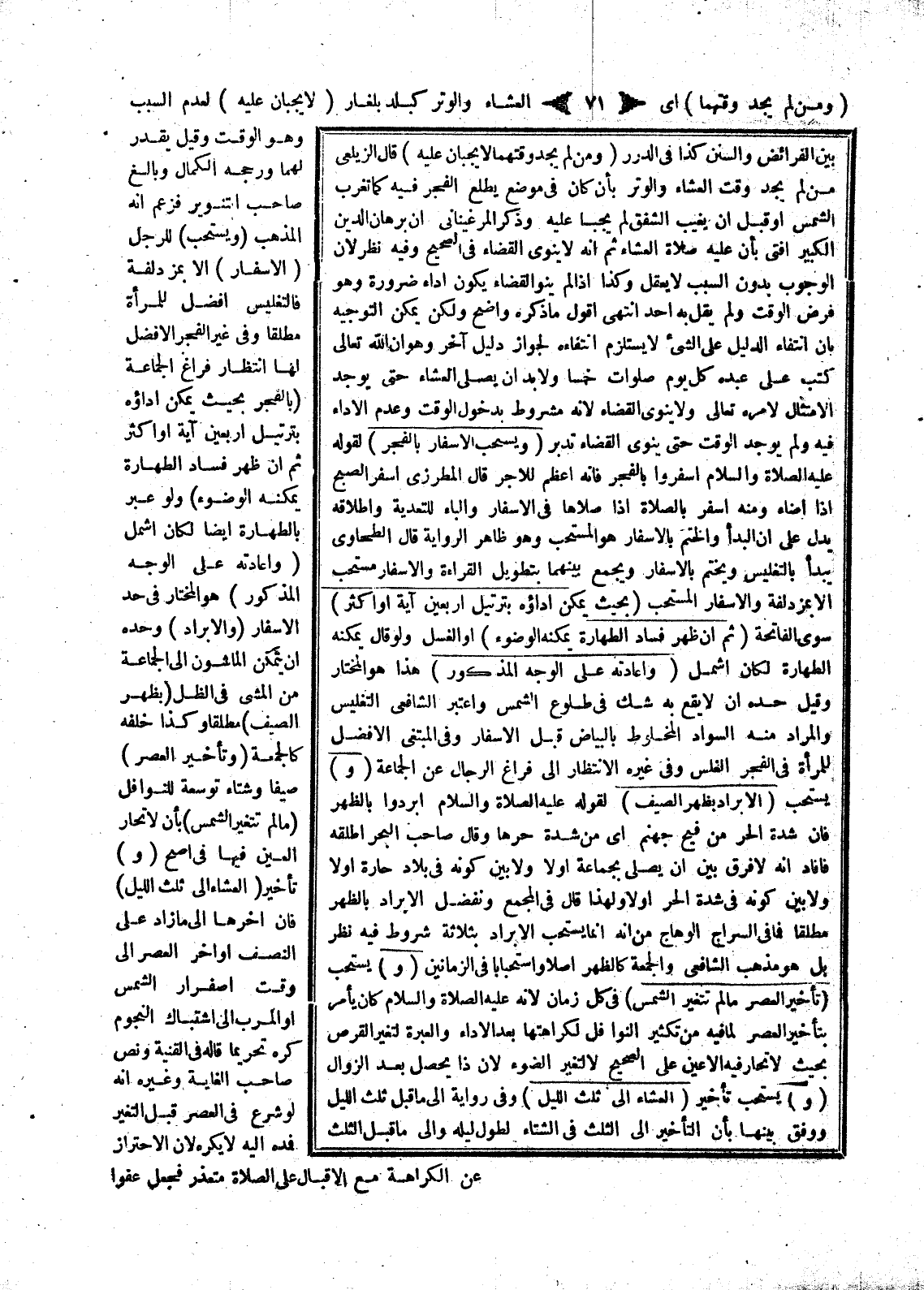 (وَمَنْ لَمْ يَجِدْ وَقْتَهُمَا لَا يَجِبَانِ عَلَيْهِ) قَالَ الزَّيْلَعِيُّ: مَنْ لَمْ يَجِدْ وَقْتَ الْعِشَاءِ وَالْوِتْرِ بِأَنْ كَانَ فِي مَوْضِعٍ يَطْلُعُ الْفَجْرُ فِيهِ كَمَا تَغْرُبُ الشَّمْسُ أَوْ قَبْلَ أَنْ يَغِيبَ الشَّفَقُ لَمْ يَجِبَا عَلَيْهِ، وَذَكَرَ الْمَرْغِينَانِيُّ أَنَّ بُرْهَانَ الدِّينِ الْكَبِيرَ أَفْتَى بِأَنَّ عَلَيْهِ صَلَاةَ الْعِشَاءِ ثُمَّ إنَّهُ لَا يَنْوِي الْقَضَاءَ فِي الصَّحِيحِ، وَفِيهِ نَظَرٌ؛ لِأَنَّ الْوُجُوبَ بِدُونِ السَّبَبِ لَا يُعْقَلُ وَكَذَا إذَا لَمْ يَنْوِ الْقَضَاءَ يَكُونُ أَدَاءً ضَرُورَةً، وَهُوَ فَرْضُ الْوَقْتِ، وَلَمْ يَقُلْ بِهِ أَحَدٌ انْتَهَى أَقُولُ مَا ذَكَرَهُ وَاضِحٌ وَلَكِنْ يُمْكِنُ التَّوْجِيهُ بِأَنَّ انْتِفَاءَ الدَّلِيلِ عَلَى الشَّيْءِ لَا يَسْتَلْزِمُ انْتِفَاءَهُ لِجَوَازِ دَلِيلٍ آخَرَ وَهُوَ أَنَّ اللَّهَ - تَعَالَى - كَتَبَ عَلَى عَبْدِهِ كُلَّ يَوْمٍ صَلَوَاتٍ خَمْسًا وَلَا بُدَّ أَنْ يُصَلِّيَ الْعِشَاءَ حَتَّى يُوجَدَ الِامْتِثَالُ لِأَمْرِهِ - تَعَالَى - وَلَا يَنْوِي الْقَضَاءَ؛ لِأَنَّهُ مَشْرُوطٌ بِدُخُولِ الْوَقْتِ وَعَدَمِ الْأَدَاءِ فِيهِ وَلَمْ يُوجَدْ الْوَقْتُ حَتَّى يَنْوِيَ الْقَضَاءَ تَدَبَّرْ.