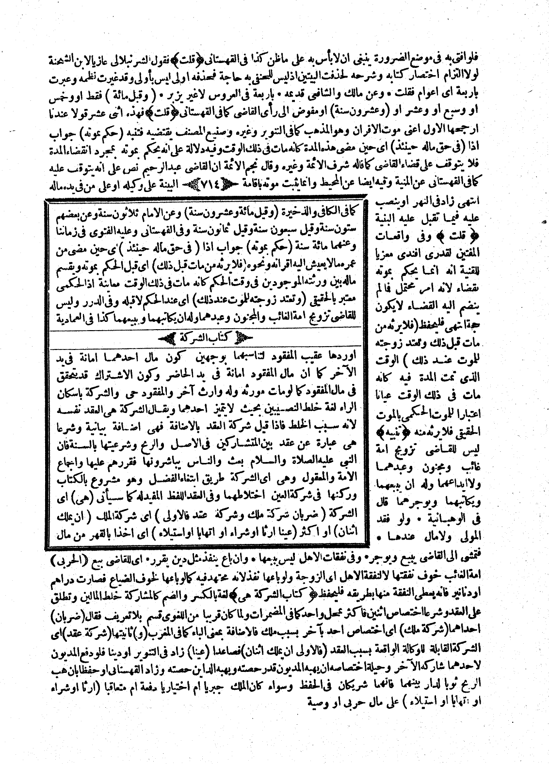 ِ أَوْرَدَهَا عَقِيبَ الْمَفْقُودِ لِتَنَاسُبِهِمَا بِوَجْهَيْنِ كَوْنُ مَالِ أَحَدِهِمَا أَمَانَةٌ فِي يَدِ الْآخَرِ كَمَا أَنَّ مَالَ الْمَفْقُودِ أَمَانَةٌ فِي يَدِ الْحَاضِرِ، وَكَوْنُ الِاشْتِرَاكِ قَدْ يَتَحَقَّقُ فِي مَالِ الْمَفْقُودِ كَمَا لَوْ مَاتَ مُوَرِّثُهُ وَلَهُ وَارِثٌ آخَرُ وَالْمَفْقُودُ حَيٌّ. وَالشِّرْكَةُ بِإِسْكَانِ الرَّاءِ لُغَةً: خَلْطُ النَّصِيبَيْنِ بِحَيْثُ لَا يَتَمَيَّزُ أَحَدُهُمَا، وَيُقَالُ الشَّرِكَةُ هِيَ الْعَقْدُ نَفْسُهُ لِأَنَّهُ سَبَبُ الْخَلْطِ فَإِذَا قِيلَ شِرْكَةُ الْعَقْدِ بِالْإِضَافَةِ فَهِيَ إضَافَةٌ بَيَانِيَّةٌ. وَشَرْعًا: هِيَ عِبَارَةٌ عَنْ عَقْدٍ بَيْنَ الْمُتَشَارِكَيْنِ فِي الْأَصْلِ وَالرِّبْحِ وَشَرْعِيَّتُهَا بِالسُّنَّةِ فَإِنَّ النَّبِيَّ - عَلَيْهِ الصَّلَاةُ وَالسَّلَامُ - بُعِثَ وَالنَّاسُ يُبَاشِرُونَهَا فَقَرَّرَهُمْ عَلَيْهَا بِإِجْمَاعِ الْأُمَّةِ وَالْمَعْقُولِ وَهِيَ أَيْ الشَّرِكَةُ طَرِيقُ ابْتِغَاءِ الْفَضْلِ وَهُوَ مَشْرُوعٌ بِالْكِتَابِ وَرُكْنُهَا فِي شَرِكَةِ الْعَيْنِ اخْتِلَاطُهُمَا.