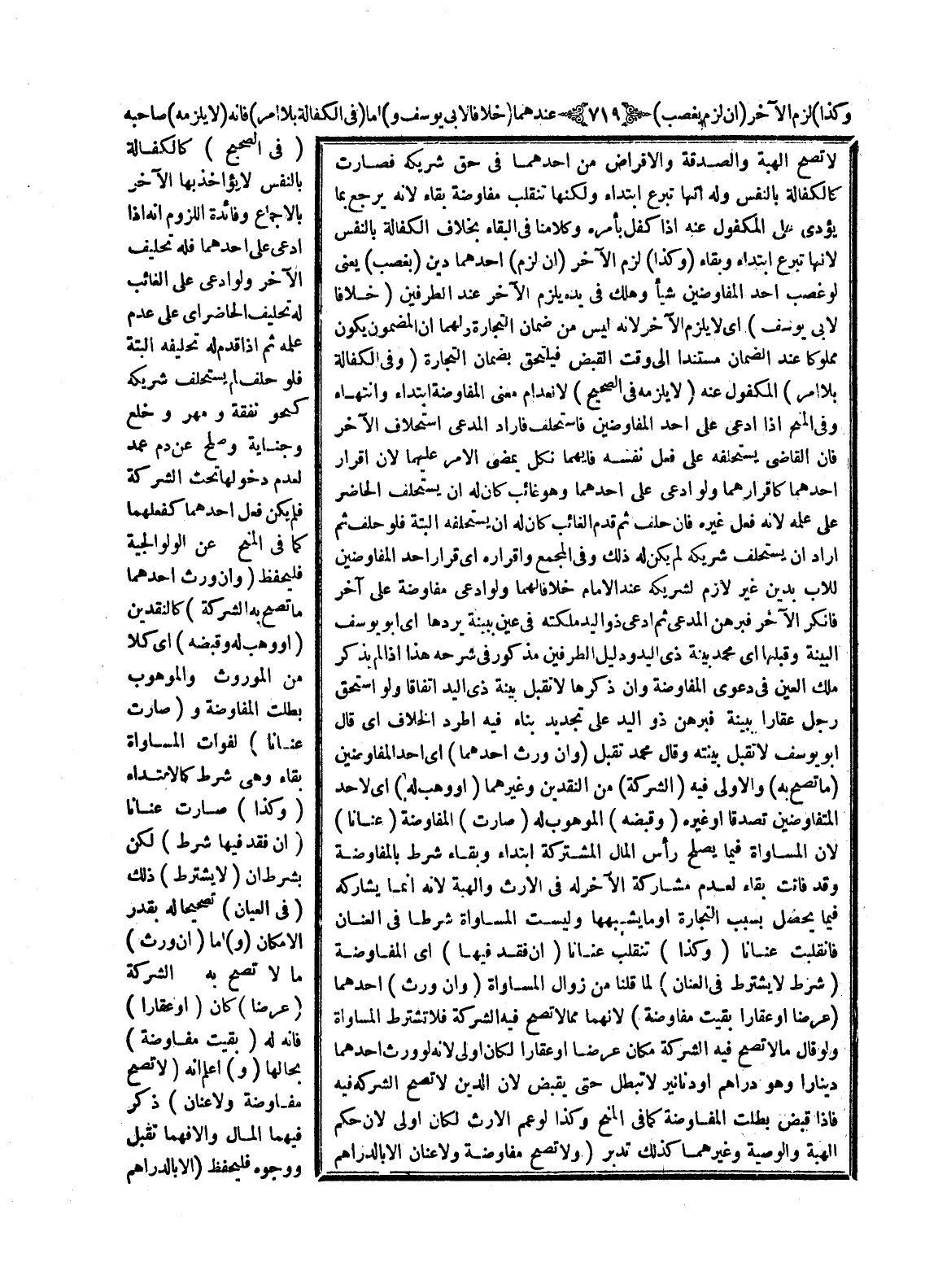 لَا تَصِحُّ الْهِبَةُ وَالصَّدَقَةُ وَالْإِقْرَاضُ مِنْ أَحَدِهِمَا فِي حَقِّ شَرِيكِهِ فَصَارَتْ كَالْكَفَالَةِ بِالنَّفْسِ، وَلَهُ أَنَّهَا تَبَرُّعٌ ابْتِدَاءً وَلَكِنَّهَا تَنْقَلِبُ مُفَاوَضَةً بَقَاءً لِأَنَّهُ يَرْجِعُ بِمَا يُؤَدِّي عَلَى الْمَكْفُولِ عَنْهُ إذَا كَفَلَ بِأَمْرِهِ، وَكَلَامُنَا فِي الْبَقَاءِ بِخِلَافِ الْكَفَالَةِ بِالنَّفْسِ لِأَنَّهَا تَبَرُّعٌ ابْتِدَاءً وَبَقَاءً.