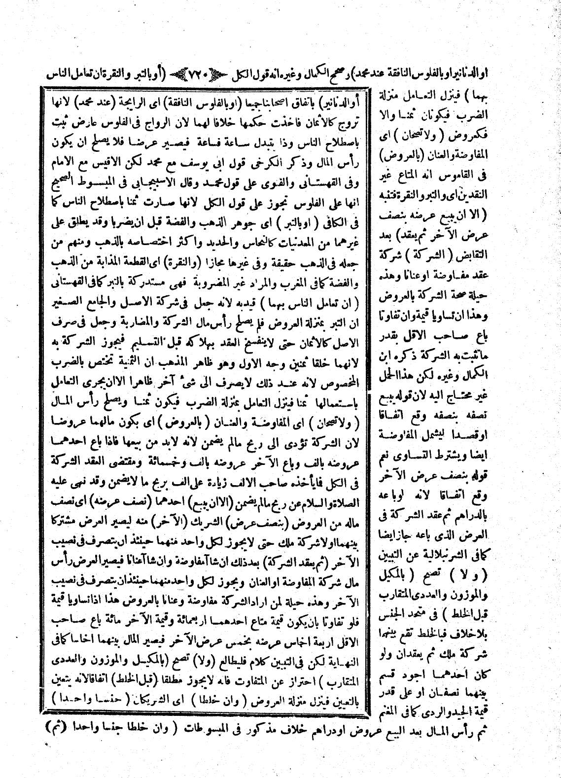 وَقَالَ الْإِسْبِيجَابِيُّ فِي الْمَبْسُوطِ الصَّحِيحُ أَنَّهَا عَلَى الْفُلُوسِ تَجُوزُ عَلَى قَوْلِ الْكُلِّ لِأَنَّهَا صَارَتْ ثَمَنًا بِاصْطِلَاحِ النَّاسِ كَمَا فِي الْكَافِي (أَوْ بِالتِّبْرِ) أَيْ جَوْهَرِ الذَّهَبِ وَالْفِضَّةِ قَبْلَ أَنْ يُضْرَبَا وَقَدْ يُطْلَقُ عَلَى غَيْرِهِمَا مِنْ الْمَعْدِنِيَّاتِ كَالنُّحَاسِ وَالْحَدِيدِ وَأَكْثَرُ اخْتِصَاصِهِ بِالذَّهَبِ، وَمِنْهُمْ مَنْ جَعَلَهُ فِي الذَّهَبِ حَقِيقَةً وَفِي غَيْرِهَا مَجَازًا (وَالنُّقْرَةِ) أَيْ الْقِطْعَةِ الْمُذَابَةِ مِنْ الذَّهَبِ وَالْفِضَّةِ كَمَا فِي الْمُغْرِبِ، وَالْمُرَادُ غَيْرُ الْمَضْرُوبَةِ فَهِيَ مُسْتَدْرَكَةٌ بِالتِّبْرِ كَمَا فِي الْقُهُسْتَانِيِّ (إنْ تَعَامَلَ النَّاسُ بِهِمَا) قَيَّدَ بِهِ لِأَنَّهُ جَعَلَ فِي شَرِكَةِ الْأَصْلِ وَالْجَامِعِ الصَّغِيرِ أَنَّ التِّبْرَ بِمَنْزِلَةِ الْعُرُوضِ فَلَمْ يَصْلُحْ رَأْسَ مَالِ الشَّرِكَةِ وَالْمُضَارَبَةِ وَجَعَلَ فِي صَرْفِ الْأَصْلِ كَالْأَثْمَانِ حَتَّى لَا يَنْفَسِخَ الْعَقْدُ بِهَلَاكِهِ قَبْلَ التَّسْلِيمِ فَيَجُوزُ الشَّرِكَةُ بِهِ لِأَنَّهُمَا خُلِقَا ثَمَنَيْنِ، وَجْهُ الْأَوَّلِ وَهُوَ ظَاهِرُ الْمَذْهَبِ أَنَّ الثَّمَنِيَّةَ تَخْتَصُّ بِالضَّرْبِ الْمَخْصُوصِ لِأَنَّهُ عِنْدَ ذَلِكَ لَا يُصْرَفُ إلَى شَيْءٍ آخَرَ ظَاهِرًا إلَّا أَنْ يَجْرِيَ التَّعَامُلُ بِاسْتِعْمَالِهَا ثَمَنًا فَيَنْزِلُ التَّعَامُلُ بِمَنْزِلَةِ الضَّرْبِ فَيَكُونُ ثَمَنًا وَيَصْلُحُ رَأْسُ الْمَالِ.