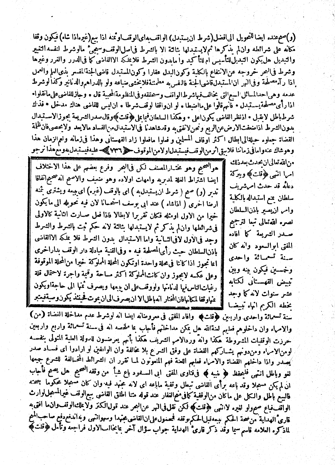 وَفِي الْقُنْيَةِ مُبَادَلَةُ دَارِ الْوَقْفِ بِدَارٍ أُخْرَى أَنَمَّا تَجُوزُ إذَا كَانَتَا فِي مَحَلَّةٍ وَاحِدَةٍ أَوْ تَكُونَ الْمَحَلَّةُ الْمَمْلُوكَةُ خَيْرًا مِنْ الْمَحَلَّةِ الْمَوْقُوفَةِ وَعَلَى عَكْسِهِ لَا يَجُوزُ وَإِنْ كَانَتْ الْمَمْلُوكَةُ أَكْثَرَ مِسَاحَةً وَقِيمَةً وَأُجْرَةً لِاحْتِمَالِ قِلَّةِ رَغَبَاتِ النَّاسِ فِيهَا لِدَنَاءَتِهَا، وَلَوْ وَقَفَ عَلَى أَنْ يَبِيعَهَا وَيَصْرِفَ ثَمَنَهَا إلَى حَاجَةٍ أَوْ يَكُونَ ثَمَنُهَا وَقْفًا لِمَكَانِهَا فَإِنَّ الْمُخْتَارَ أَنَّهُ بَاطِلٌ إلَّا أَنْ يَصْرِفَ إلَى أَنْ يَمُوتَ فَحِينَئِذٍ يَكُونُ وَصِيَّةً فَيُعْتَبَرُ