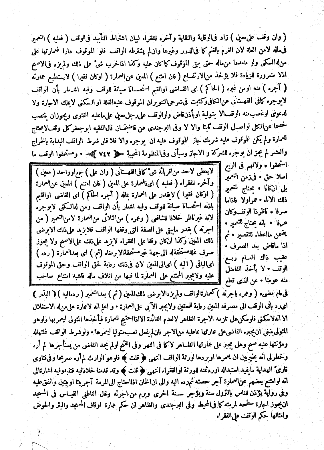 (وَإِنْ عَلَى) جَمْعٍ أَوْ وَاحِدٍ (مُعَيَّنٍ) وَآخِرُهُ لِلْفُقَرَاءِ (فَعَلَيْهِ) أَيْ فَالْعِمَارَةُ عَلَى الْمُعَيَّنِ (فَإِنْ امْتَنَعَ) الْمُعَيَّنُ عَنْ الْعِمَارَةِ (أَوْ كَانَ فَقِيرًا) لَا يَقْدِرُ عَلَى الْعِمَارَةِ بِمَالِهِ (آجَرَهُ الْحَاكِمُ) أَيْ الْقَاضِي أَوْ الْقَيِّمُ بِإِذْنِهِ اسْتِحْسَانًا صِيَانَةً لِلْوَقْفِ وَفِيهِ إشْعَارٌ بِأَنَّ الْوَاقِفَ وَمَنْ لَهُ السُّكْنَى لَا يُؤَجِّرُهُ لِأَنَّهُ غَيْرُ نَاظِرٍ خِلَافًا لِلشَّافِعِيِّ (وَعَمَرَهُ) مِنْ الثُّلَاثِيِّ مِنْ الْعِمَارَةِ لَا مِنْ التَّعْمِيرِ (مِنْ أُجْرَتِهِ) بِقَدْرِ مَا يَبْقَى عَلَى الصِّفَةِ الَّتِي وَقَفَهَا الْوَاقِفُ فَلَا يَزِيدُ عَلَى ذَلِكَ إلَّا بِرِضَا ذَلِكَ الْمُعَيَّنِ وَكَذَا إنْ كَانَ وَقْفًا عَلَى الْفُقَرَاءِ لَا يَزِيدُ عَلَى ذَلِكَ عَلَى الْأَصَحُّ وَلَا يَجُوزُ صَرْفُ غَلَّةٍ مُسْتَحَقَّةٍ لَهُ إلَى جِهَةٍ غَيْرِ مُسْتَحَقَّةٍ إلَّا بِرِضَاهُ (ثُمَّ) أَيْ بَعْدَ الْعِمَارَةِ (رَدَّهُ) أَيْ الْبَاقِي (إلَيْهِ) أَيْ إلَى الْمُعَيَّنِ لِأَنَّ فِي ذَلِكَ رِعَايَةً لِحَقِّ الْوَاقِفِ وَحَقِّ الْمَوْقُوفِ عَلَيْهِ وَلَا يُجْبَرُ الْمُمْتَنِعُ عَلَى الْعِمَارَةِ لِمَا فِيهَا مِنْ إتْلَافِ مَالِهِ فَأَشْبَهَ امْتِنَاعَ صَاحِبِ
