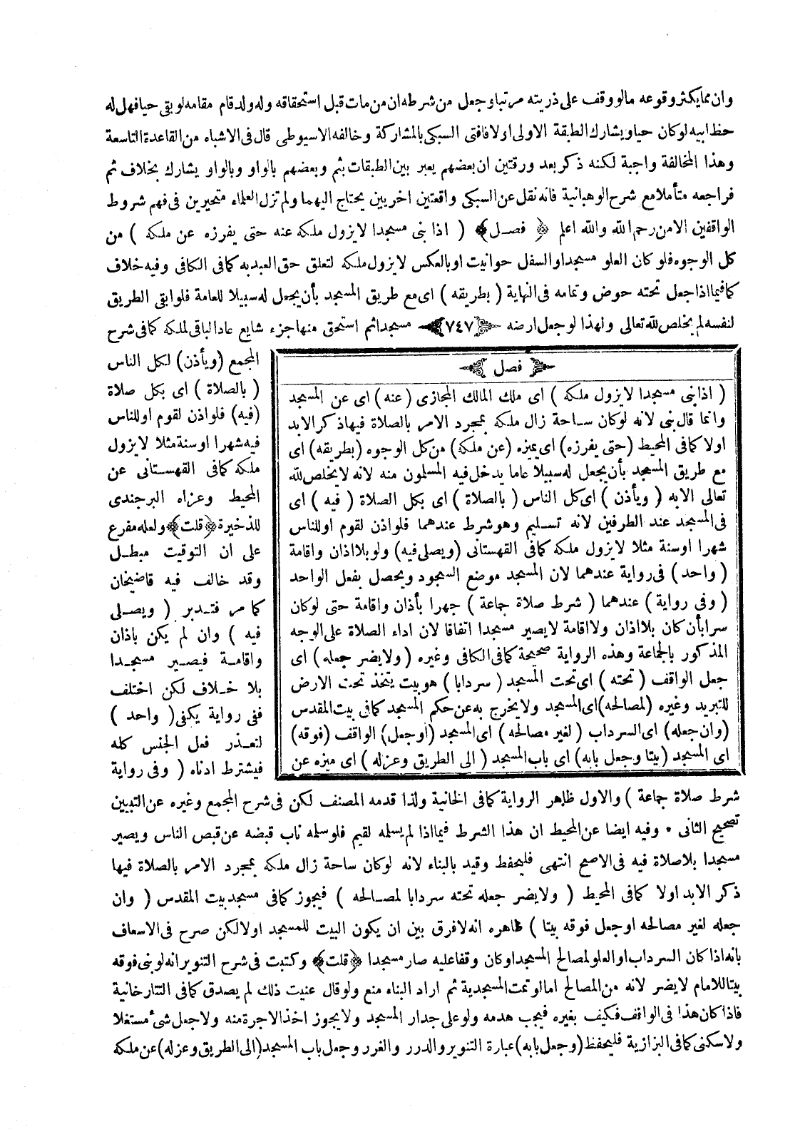 فَصَلِّ (إذَا بَنَى مَسْجِدًا لَا يَزُولُ مِلْكُهُ) أَيْ مِلْكُ الْمَالِكِ الْمَجَازِيِّ (عَنْهُ) أَيْ عَنْ الْمَسْجِدِ وَإِنَّمَا قَالَ بَنَى لِأَنَّهُ لَوْ كَانَ سَاحَةً زَالَ مِلْكُهُ بِمُجَرَّدِ الْأَمْرِ بِالصَّلَاةِ فِيهَا ذَكَرَ الْأَبَدَ أَوْ لَا كَمَا فِي الْمُحِيطِ (حَتَّى يَفْرِزَهُ) أَيْ يُمَيِّزَهُ (عَنْ مِلْكِهِ) مِنْ كُلِّ الْوُجُوهِ (بِطَرِيقِهِ) أَيْ مَعَ طَرِيقِ الْمَسْجِدِ بِأَنْ يَجْعَلَ لَهُ سَبِيلًا عَامًّا يَدْخُلُ فِيهِ الْمُسْلِمُونَ مِنْهُ لِأَنَّهُ لَا يَخْلُصُ لِلَّهِ تَعَالَى إلَّا بِهِ (وَيَأْذَنَ) أَيْ لِكُلِّ النَّاسِ (بِالصَّلَاةِ) أَيْ بِكُلِّ الصَّلَاةِ (فِيهِ) أَيْ فِي الْمَسْجِدِ عِنْدَ الطَّرَفَيْنِ لِأَنَّهُ تَسْلِيمٌ وَهُوَ شَرْطٌ عِنْدَهُمَا فَلَوْ أَذِنَ لِقَوْمٍ أَوْ لِلنَّاسِ شَهْرًا أَوْ سَنَةً مَثَلًا لَا يَزُولُ مِلْكُهُ كَمَا فِي الْقُهُسْتَانِيِّ (وَيُصَلِّي فِيهِ) وَلَوْ بِلَا أَذَانٍ وَإِقَامَةٍ (وَاحِدٌ) .
