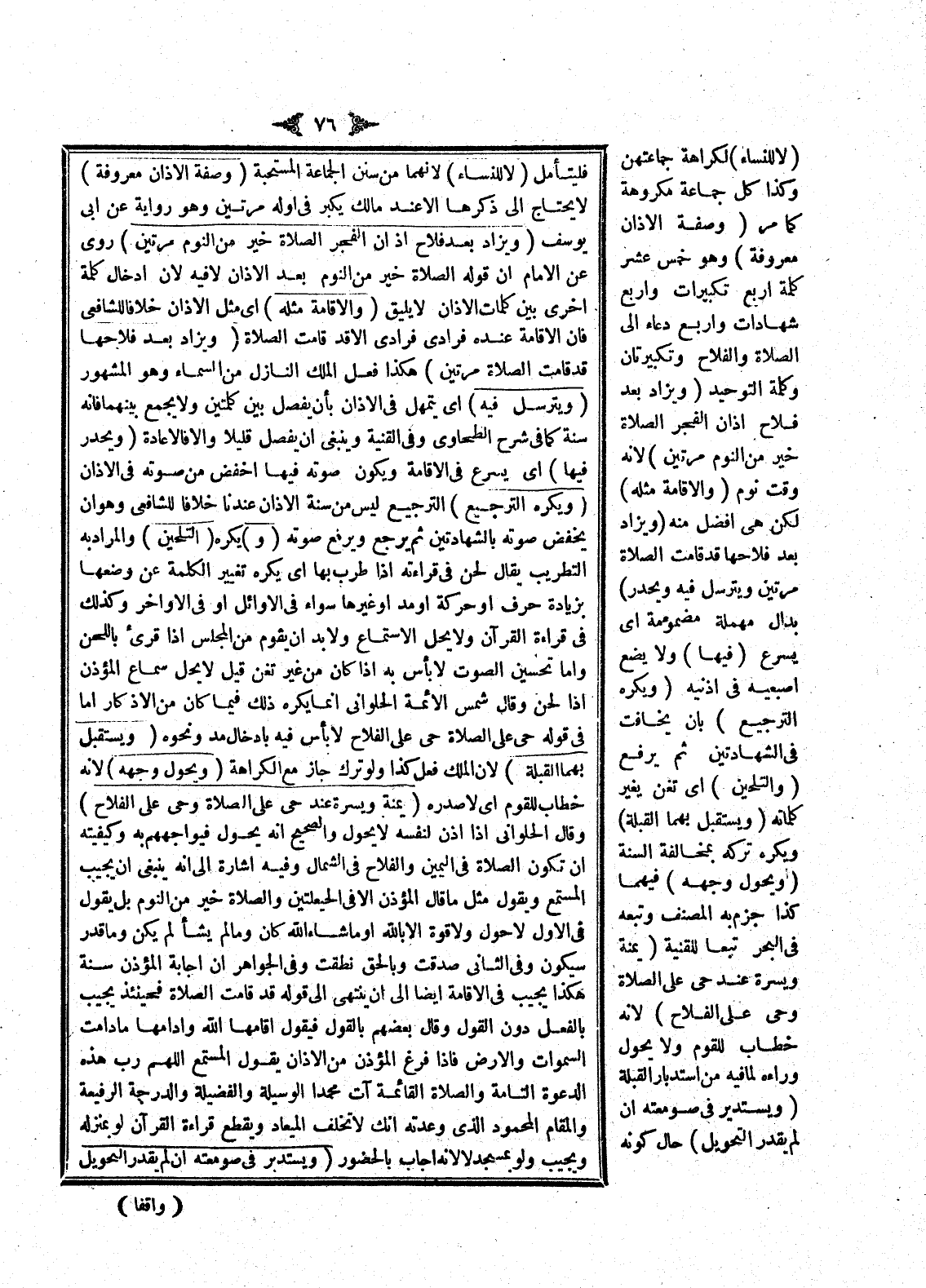 وَقَالَ بَعْضُهُمْ بِالْقَوْلِ فَيَقُولُ أَقَامَهَا اللَّهُ وَأَدَامَهَا مَا دَامَتْ السَّمَوَاتُ وَالْأَرْضُ فَإِذَا فَرَغَ الْمُؤَذِّنُ مِنْ الْأَذَانِ يَقُولُ الْمُسْتَمِعُ: اللَّهُمَّ رَبَّ هَذِهِ الدَّعْوَةِ التَّامَّةِ وَالصَّلَاةِ الْقَائِمَةِ آتِ مُحَمَّدًا الْوَسِيلَةَ وَالْفَضِيلَةَ وَالدَّرَجَةَ الرَّفِيعَةَ وَالْمَقَامَ الْمَحْمُودَ الَّذِي وَعَدْته إنَّك لَا تُخْلِفُ الْمِيعَادَ، وَيَقْطَعُ قِرَاءَةَ الْقُرْآنِ لَوْ بِمَنْزِلِهِ وَيُجِيبُ وَلَوْ بِمَسْجِدٍ لَا لِأَنَّهُ أَجَابَ بِالْحُضُورِ.