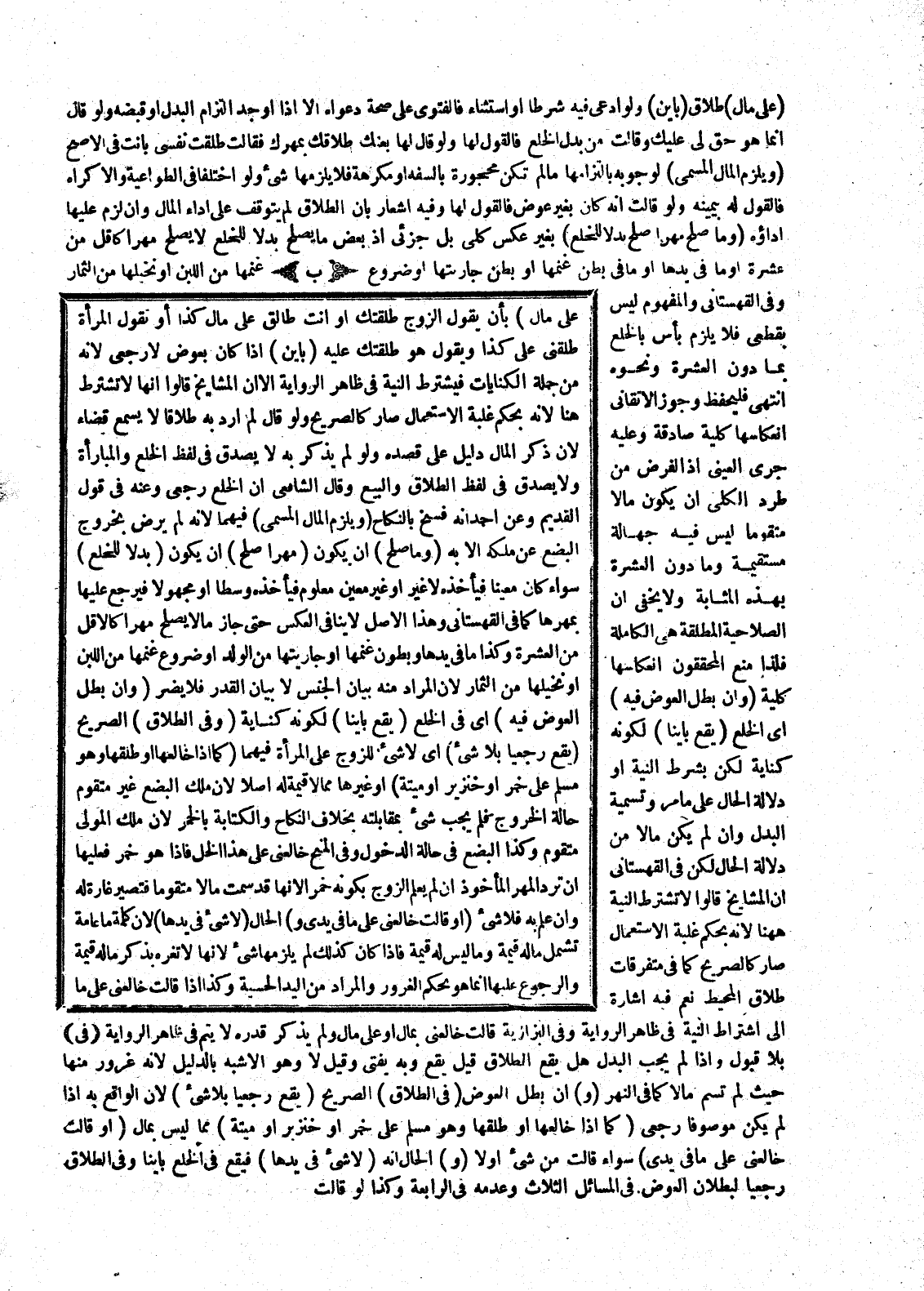 عَلَى مَالٍ) بِأَنْ يَقُولَ الزَّوْجُ طَلَّقْتُك أَوْ أَنْتِ طَالِقٌ عَلَى مَالٍ كَذَا أَوْ تَقُولَ الْمَرْأَةُ طَلِّقْنِي عَلَى كَذَا وَيَقُولَ هُوَ طَلَّقْتُك عَلَيْهِ (بَائِنٌ) إذَا كَانَ بِعِوَضٍ لَا رَجْعِيٌّ لِأَنَّهُ مِنْ جُمْلَةِ الْكِنَايَاتِ فَيُشْتَرَطُ النِّيَّةُ فِي ظَاهِرِ الرِّوَايَةِ إلَّا أَنَّ الْمَشَايِخَ قَالُوا إنَّهَا لَا تُشْتَرَطُ هُنَا لِأَنَّهُ بِحُكْمِ غَلَبَةِ الِاسْتِعْمَالِ صَارَ كَالصَّرِيحِ وَلَوْ قَالَ لَمْ أُرِدْ بِهِ طَلَاقًا لَا يُسْمَعُ قَضَاءً لِأَنَّ ذِكْرَ الْمَالِ دَلِيلٌ عَلَى قَصْدِهِ، وَلَوْ لَمْ يَذْكُرْهُ لَا يُصَدَّقُ فِي لَفْظِ الْخُلْعِ وَالْمُبَارَأَةِ وَلَا يُصَدَّقُ فِي لَفْظِ الطَّلَاقِ وَالْبَيْعِ.