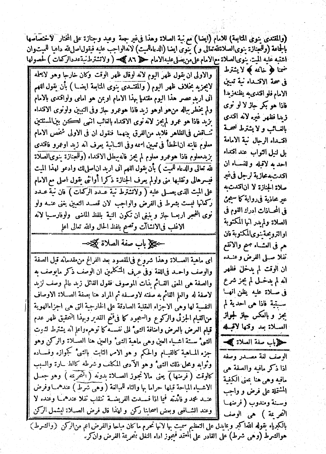 أَيْ مَاهِيَّةِ الصَّلَاةِ وَهَذَا شُرُوعٌ فِي الْمَقْصُودِ بَعْدَ الْفَرَاغِ مِنْ مُقَدَّمَاتِهِ قِيلَ الصِّفَةُ وَالْوَصْفُ وَاحِدٌ فِي اللُّغَةِ وَفِي عُرْفِ الْمُتَكَلِّمِينَ أَنَّ الْوَصْفَ ذِكْرُ مَا يُوصَفُ بِهِ، وَالصِّفَةُ هِيَ الْمَعْنَى الْقَائِمُ بِذَاتِ الْمَوْصُوفِ فَقَوْلُ الْقَائِلِ: زَيْدٌ عَالِمٌ وَصْفٌ لِزَيْدٍ لَا صِفَةٌ لَهُ، وَالْعِلْمُ الْقَائِمُ بِهِ صِفَتُهُ لَا وَصْفُهُ ثُمَّ الْمُرَادُ هُنَا بِصِفَةِ الصَّلَاةِ الْأَوْصَافُ النَّفْسِيَّةُ لَهَا وَهِيَ الْأَجْزَاءُ الْعَقْلِيَّةُ الصَّادِقَةُ عَلَى الْخَارِجِيَّةِ الَّتِي هِيَ أَجْزَاءُ الْهُوِيَّةِ مِنْ الْقِيَامِ الْجُزْئِيِّ وَالرُّكُوعِ وَالسُّجُودِ كَمَا فِي فَتْحِ الْقَدِيرِ، وَبِهَذَا التَّحْقِيقِ ظَهَرَ عَدَمُ قِيَامِ الْعَرْضِ بِالْعَرْضِ وَإِضَافَةِ الشَّيْءِ إلَى نَفْسِهِ كَمَا تَوَهَّمَ