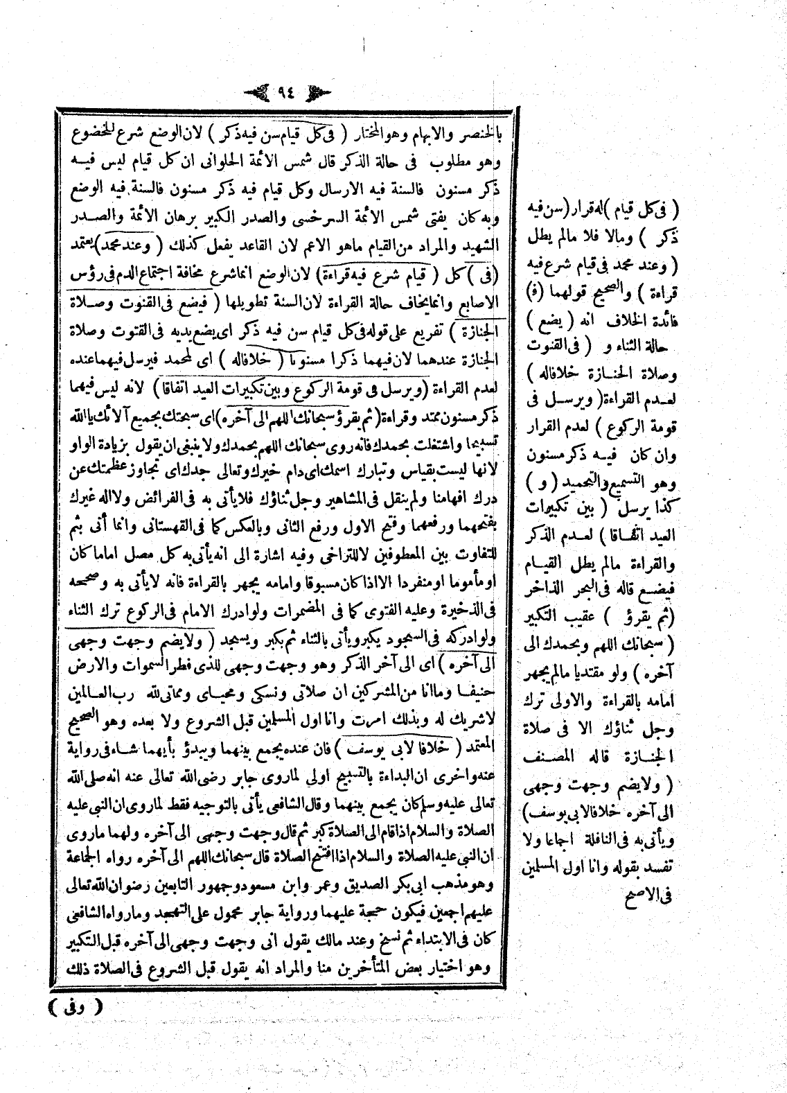 بِالْخِنْصِرِ وَالْإِبْهَامِ، وَهُوَ الْمُخْتَارُ (فِي كُلِّ قِيَامٍ سُنَّ فِيهِ ذِكْرٌ) ؛ لِأَنَّ الْوَضْعَ شَرْعٌ لِلْخُضُوعِ، وَهُوَ مَطْلُوبٌ فِي حَالَةِ الذِّكْرِ، قَالَ شَمْسُ الْأَئِمَّةِ الْحَلْوَانِيُّ: إنَّ كُلَّ قِيَامٍ لَيْسَ فِيهِ ذِكْرٌ مَسْنُونٌ فَالسُّنَّةُ فِيهِ الْإِرْسَالُ، وَكُلُّ قِيَامٍ فِيهِ ذِكْرٌ مَسْنُونٌ فَالسُّنَّةُ فِيهِ الْوَضْعُ وَبِهِ كَانَ يُفْتِي شَمْسُ الْأَئِمَّةِ السَّرَخْسِيُّ وَالصَّدْرُ الْكَبِيرُ بُرْهَانُ الْأَئِمَّةِ وَالصَّدْرُ الشَّهِيدُ، وَالْمُرَادُ مِنْ الْقِيَامِ مَا هُوَ الْأَعَمُّ؛ لِأَنَّ الْقَاعِدَ يَفْعَلُ كَذَلِكَ.
