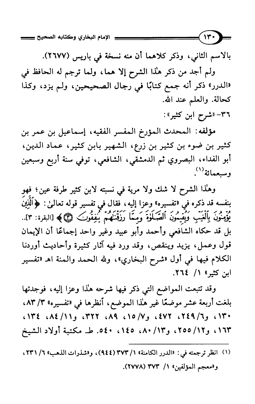 وهذا الشرح لا شك ولا مرية في نسبته لابن كثير طرفة عين؛ فهو بنفسه قد ذكره في "تفسيره" وعزا إليه، فقال في تفسير قوله تعالى: {الَّذِينَ يُؤْمِنُونَ بِالْغَيْبِ وَيُقِيمُونَ الصَّلَاةَ وَمِمَّا رَزَقْنَاهُمْ يُنْفِقُونَ (3)} [البقرة: 3] .. بل قد حكاه الشاَفعي وأحمد وأبو عبيد وغير واحد إجماعًا أن الإيمان قول وعمل، يزيد وينقص، وقد ورد فيه آثار كثيرة وأحاديث أوردنا الكلام فيها في أول "شرح البخاري"، ولله الحمد والمنة اهـ "تفسير ابن كثير" 1/ 264.
