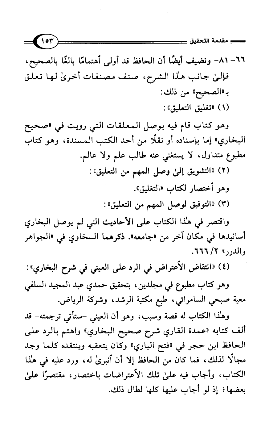 66 - 81 - ونضيف أيضًا أن الحافظ قد أولى اهتمامًا بالغًا بالصحيح، فإلى جانب هذا الشرح، صنف مصنفات أخرى لها تعلق بـ "الصحيح" من ذلك: