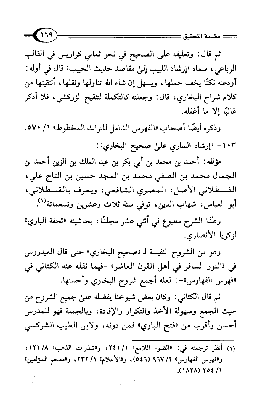 ثم قال: وتعليقه على الصحيح في نحو ثماني كراريس في القالب الرباعي، سماه "إرشاد اللبيب إلى مقاصد حديث الحبيب" قال في أوله: أودعته نكتًا يخف حملها، ويسهل إن شاء الله تناولها ونقلها، انتقيتها من كلام شراح البخاري، قال: وجعلته كالتكملة لتنقيح الزركشي، فلا أذكر غالبًا إلا ما أغفله.