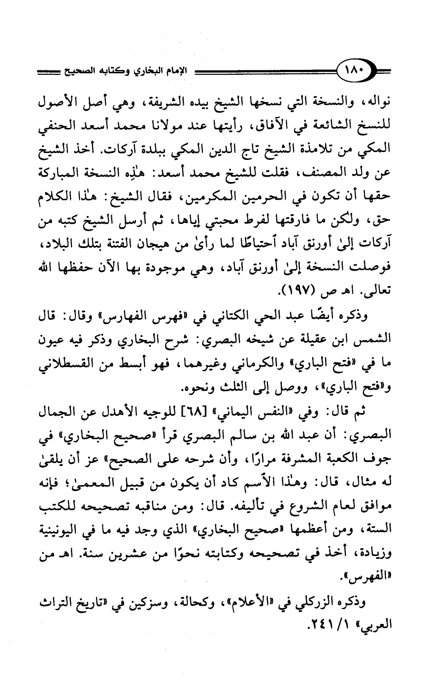 نواله، والنسخة التي نسخها الشيخ بيده الشريفة، وهي أصل الأصول للنسخ الشائعة في الآفاق، رأيتها عند مولانا محمد أسعد الحنفي المكي من تلامذة الشيخ تاج الدين المكي ببلدة آركات. أخذ الشيخ عن ولد المصنف، فقلت للشيخ محمد أسعد: هذِه النسخة المباركة حقها أن تكون في الحرمين المكرمين، فقال الشيخ: هذا الكلام حق، ولكن ما فارقتها لفرط محبتي إياها، ثم أرسل الشيخ كتبه من آركات إلى أورنق آباد احتياطًا لما رأى من هيجان الفتنة بتلك البلاد، فوصلت النسخة إلى أورنق آباد، وهي موجودة بها الآن حفظها الله تعالى. اهـ ص (197).
