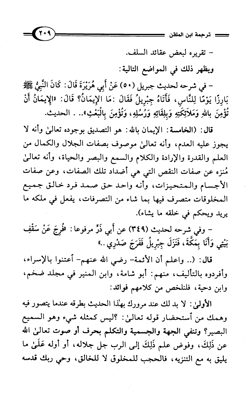 - في شرحه لحديث جبريل (50) عَنْ أَبِي هُرَيْرَةَ قَالَ: كَانَ النَّبِيُّ - صلى الله عليه وسلم - بَارِزًا يَوْمًا لِلنَّاسِ، فَأَتَاهُ جِبْرِيلُ فَقَالَ: مَا الإِيمَانُ؟ قَالَ: "الإِيمَانُ أَنْ تُؤْمِنَ باللهِ وَمَلاَئِكَتِهِ وَبِلِقَائِهِ وَرُسُلِهِ، وَتُؤْمِنَ بِالْبَعْثِ" ... الحديث.