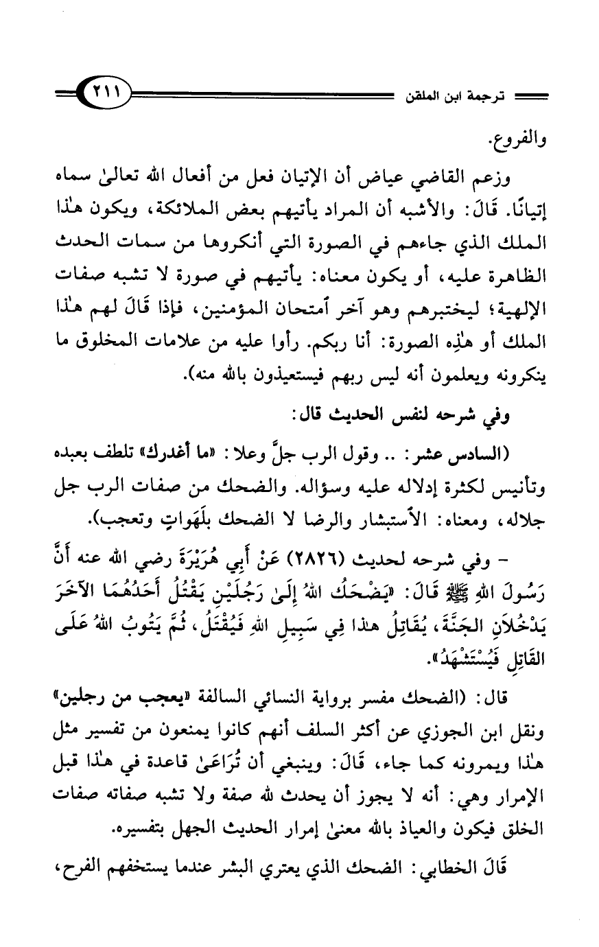 قال: (الضحك مفسر برواية النسائي السالفة "يعجب من رجلين" ونقل ابن الجوزي عن أكثر السلف أنهم كانوا يمنعون من تفسير مثل هذا ويمرونه كما جاء، قَالَ: وينبغي أن تُرَاعَى قاعدة في هذا قبل الإمرار وهي: أنه لا يجوز أن يحدث لله صفة ولا تشبه صفاته صفات الخلق فيكون والعياذ بالله معنى إمرار الحديث الجهل بتفسيره.