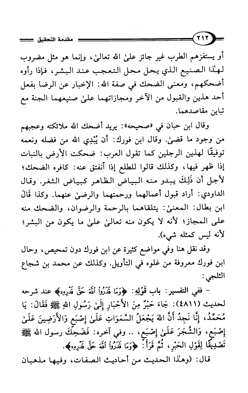 - ففي التفسير: باب قَوْلهِ: {وَمَا قَدَرُوا اللَّهَ حَقَّ قَدْرِهِ} عند شرحه لحديث (4811): جَاءَ حَبْرٌ مِنَ الأَحْبَارِ إِلَى رَسُولِ اللهِ - صلى الله عليه وسلم - فَقَالَ: يَا مُحَمَّدُ، إِنَّا نَجِدُ أَنَّ اللهَ يَجْعَلُ السمَوَاتِ عَلَى إِصْبَعِ وَالأَرَضِينَ عَلَى إِصْبَع، وَالشَّجَرَ عَلَى إِصْبَع" .. وفي آخره: فَضَحِكَ رسول الله - صلى الله عليه وسلم - تَصْدِيقًا لِقَوْلِ الحَبْرِ، ثُمَّ قَرَأَ: {وَمَا قَدَرُوا اللَّهَ حَقَّ قَدْرِهِ}.