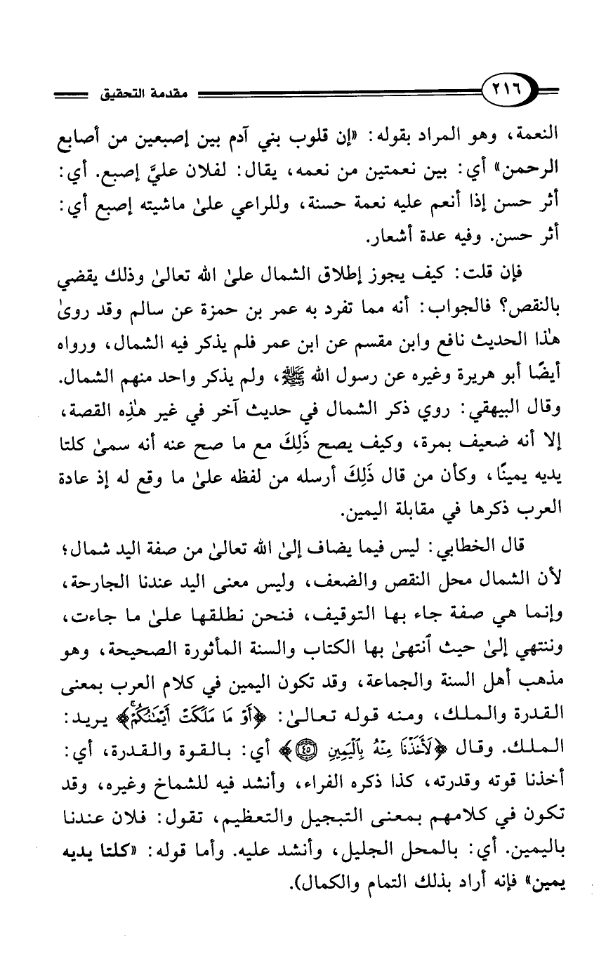 النعمة، وهو المراد بقوله: "إن قلوب بني آدم بين إصبعين من أصابع الرحمن" أي: بين نعمتين من نعمه، يقال: لفلان عليَّ إصبع. أي: أثر حسن إذا أنعم عليه نعمة حسنة، وللراعي على ماشيته إصبع أي: أثر حسن. وفيه عدة أشعار.