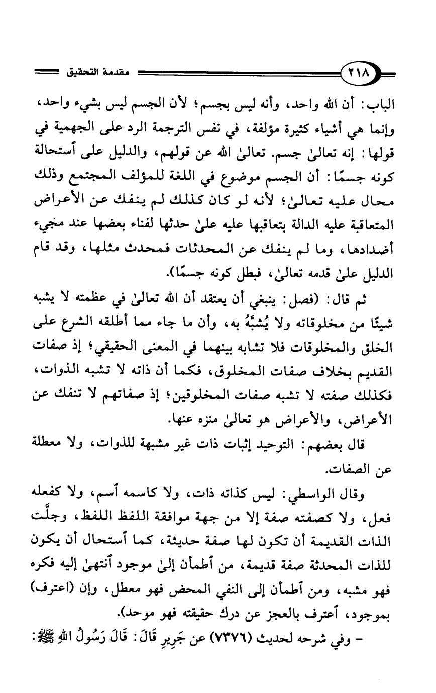 الباب: أن الله واحد، وأنه ليس بجسم؛ لأن الجسم ليس بشيء واحد، وإنما هي أشياء كثيرة مؤلفة، في نفس الترجمة الرد على الجهمية في قولها: إنه تعالى جسم. تعالى الله عن قولهم، والدليل على استحالة كونه جسمًا: أن الجسم موضوع في اللغة للمؤلف المجتمع وذلك محال عليه تعالى؛ لأنه لو كان كذلك لم ينفك عن الأعراض المتعاقبة عليه الدالة بتعاقبها عليه على حدثها لفناء بعضها عند مجيء أضدادها، وما لم ينفك عن المحدثات فمحدث مثلها، وقد قام الدليل على قدمه تعالى، فبطل كونه جسمًا).