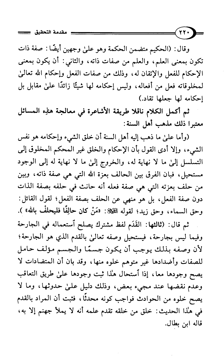 (وأما على ما ذهب إليه أهل السنة أن خلق الشيء وإحكامه هو نفس الشيء، وإلا أدى القول بأن الأحكام والخلق غير المحكم المخلوق إلى التسلسل إلى ما لا نهاية له، والخروج إلى ما لا نهاية له إلى الوجود مستحيل، فبان الفرق بين الحالف بعزة الله التي هي صفة ذاته، وبين من حلف بعزته التي هي صفة فعله أنه حانث في حلفه بصفة الذات دون صفة الفعل، بل هو منهي عن الحلف بصفة الفعل؛ لقول القائل: وحق السماء، وحق زيد؛ لقوله -عليه السلام-: "مَنْ كان حالِفًا فليحلفْ بالله").