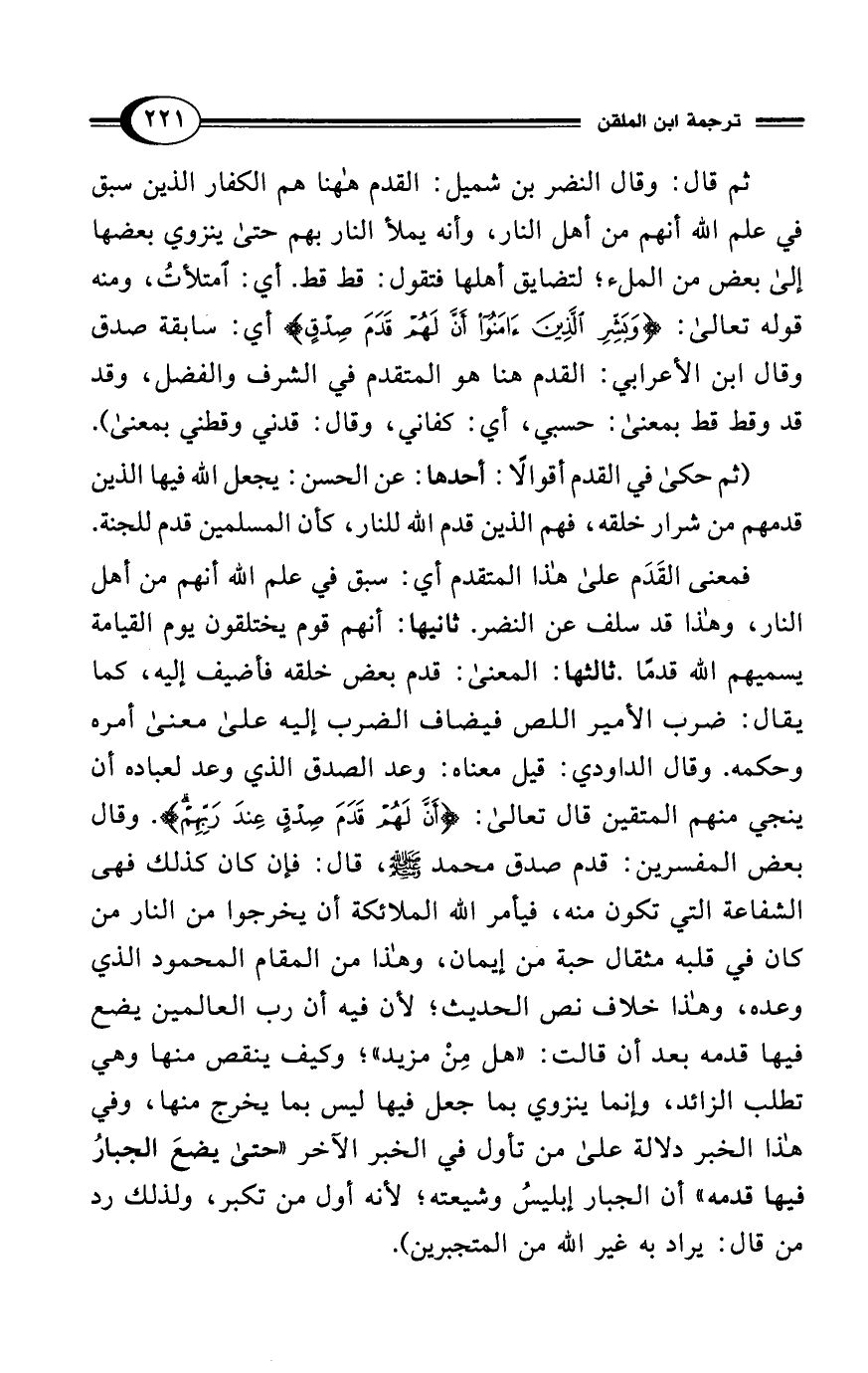ثم قال: وقال النضر بن شميل: القدم ها هنا هم الكفار الذين سبق في علم الله أنهم من أهل النار، وأنه يملأ النار بهم حتى ينزوي بعضها إلى بعض من الملء؛ لتضايق أهلها فتقول: قط قط. أي: امتلأتُ، ومنه قوله تعالى: {وَبَشِّرِ الَّذِينَ آمَنُوا أَنَّ لَهُمْ قَدَمَ صِدْقٍ} أي: سابقة صدق وقال ابن الأعرابي: القدم هنا هو المتقدم في الشرف والفضل، وقد قد وقط قط بمعنى: حسبي، أي: كفاني، وقال: قدني وقطني بمعنى).