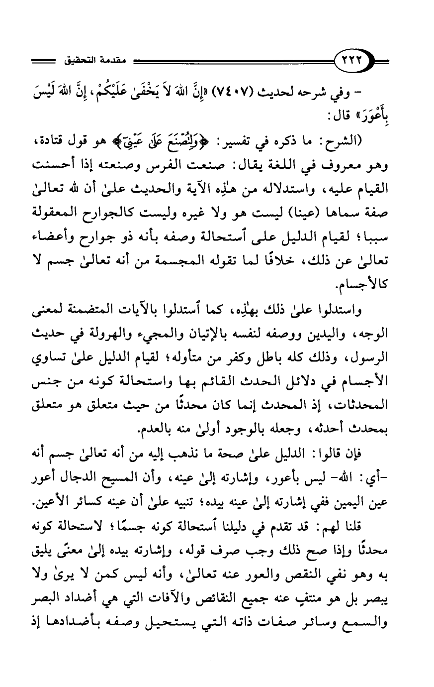 - وفي شرحه لحديث (7407) "إِنَّ اللهَ لاَ يَخْفَى عَلَيْكُمْ، إِنَّ اللهَ لَيْسَ بِأَعْوَرَ" قال: