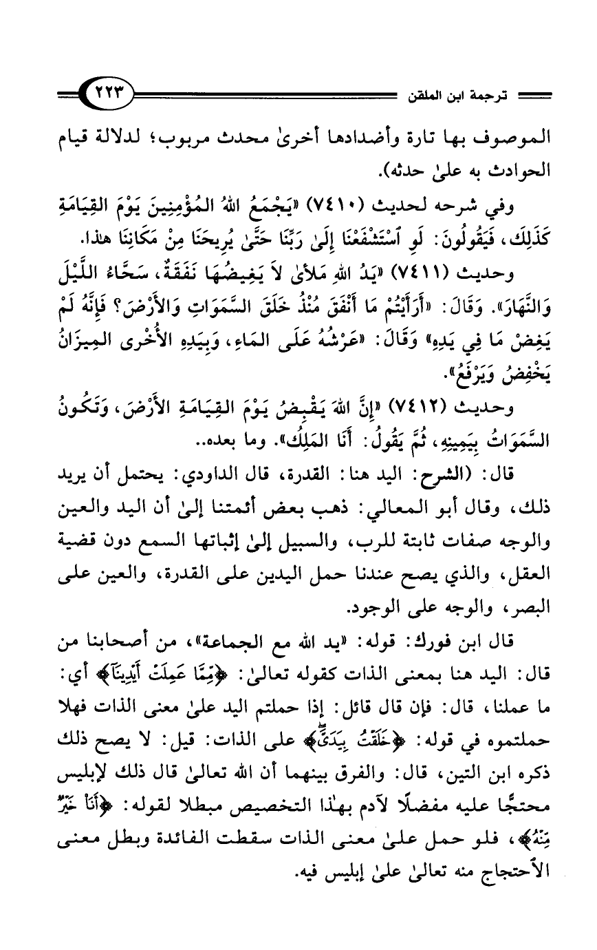 وحديث (7411) "يَدُ اللهِ مَلأى لاَ يَغِيضُهَا نَفَقَةٌ، سَحَّاءُ اللَّيْلَ وَالنَّهَارَ". وَقَالَ: "أَرَأَيْتُمْ مَا أَنْفَقَ مُنْذُ خَلَقَ السمَوَاتِ وَالأَرْضَ؟ فَإِنَّهُ لَمْ يَغِضْ مَا فِي يَده" وَقَالَ: "عَرْشُهُ عَلَى المَاءِ، وَبِيَدِهِ الأُخْرى المِيزَانُ يَخْفِضُ وَيَرْفَعُ".
