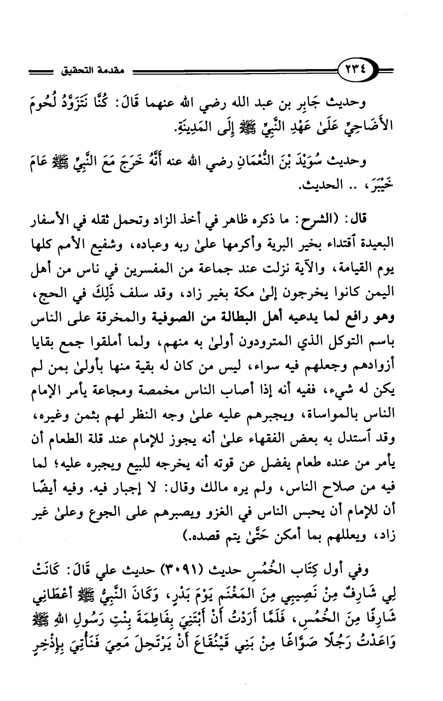 قال: (الشرح: ما ذكره ظاهر في أخذ الزاد وتحمل ثقله في الأسفار البعيدة اقتداء بخير البرية وأكرمها على ربه وعباده، وشفيع الأمم كلها يوم القيامة، والآية نزلت عند جماعة من المفسرين في ناس من أهل اليمن كانوا يخرجون إلى مكة بغير زاد، وقد سلف ذَلِكَ في الحج، وهو رافع لما يدعيه أهل البطالة من الصوفية والمخرقة على الناس باسم التوكل الذي المترودون أولى به منهم، ولما أملقوا جمع بقايا أزوادهم وجعلهم فيه سواء، ليس من كان له بقية منها بأولى بمن لم يكن له شيء، ففيه أنه إذا أصاب الناس مخمصة ومجاعة يأمر الإمام الناس بالمواساة، ويجبرهم عليه على وجه النظر لهم بثمن وغيره، وقد استدل به بعض الفقهاء على أنه يجوز للإمام عند قلة الطعام أن يأمر من عنده طعام يفضل عن قوته أنه يخرجه للبيع ويجبره عليه؛ لما فيه من صلاح الناس، ولم يره مالك وقال: لا إجبار فيه. وفيه أيضًا أن للإمام أن يحبس الناس في الغزو ويصبرهم على الجوع وعلى غير زاد، ويعللهم بما أمكن حَتَّى يتم قصده.)