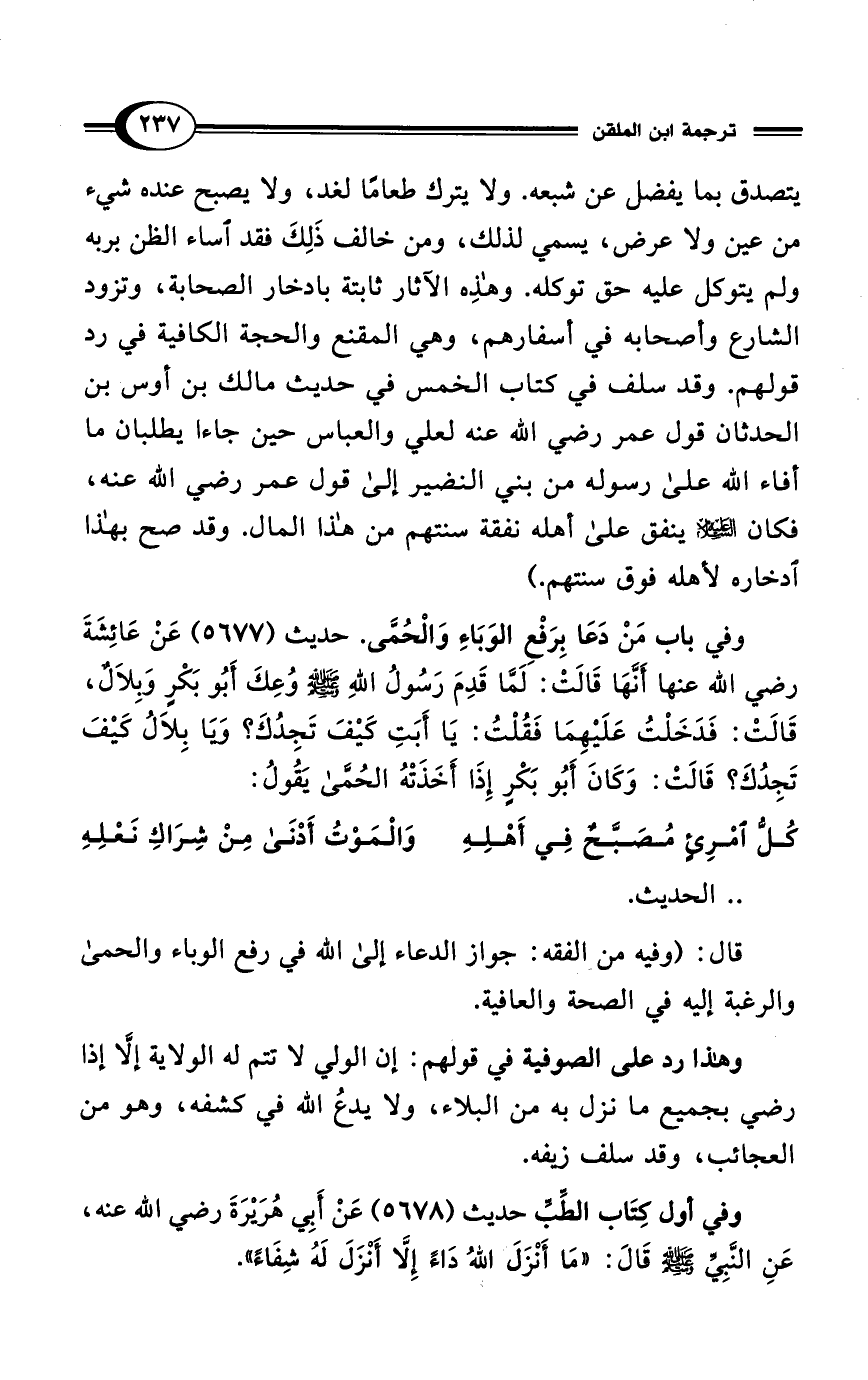 وفي باب مَنْ دَعَا بِرَفْعِ الوَبَاءِ وَالْحُمَّى. حديث (5677) عَنْ عَائِشَةَ رضي الله عنها أَنَّهَا قَالَتْ: لَمَّا قَدِمَ رَسُولُ الله - صلى الله عليه وسلم - وُعِكَ أَبُو بَكْرٍ وَبِلاَل، قَالَتْ: فَدَخَلْتُ عَلَيْهِمَا فَقُلْتُ: يَا أَبَتِ كَيْفَ تَجِدُكَ؟ وَيَا بِلاَلُ كَيْفَ تَجِدُكَ؟ قَالَتْ: وَكَانَ أَبُو بَكْرٍ إِذَا أَخَذَتْهُ الحُمَّى يَقُولُ: