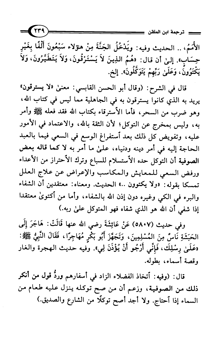 الأُمَمُ، .. الحديث وفيه: وَيَدْخُلُ الجَنَّةَ مِنْ هؤلاء سَبْعُونَ أَلْفًا بِغَيْرِ حِسَابٍ". إلى أن قال: "هُمُ الذِينَ لاَ يَسْتَرْقُونَ، وَلاَ يَتَطَيَّرُونَ، وَلاَ يَكْتَوُونَ، وَعَلَى رَبِّهِمْ يَتَوَكَّلُونَ". إلخ.