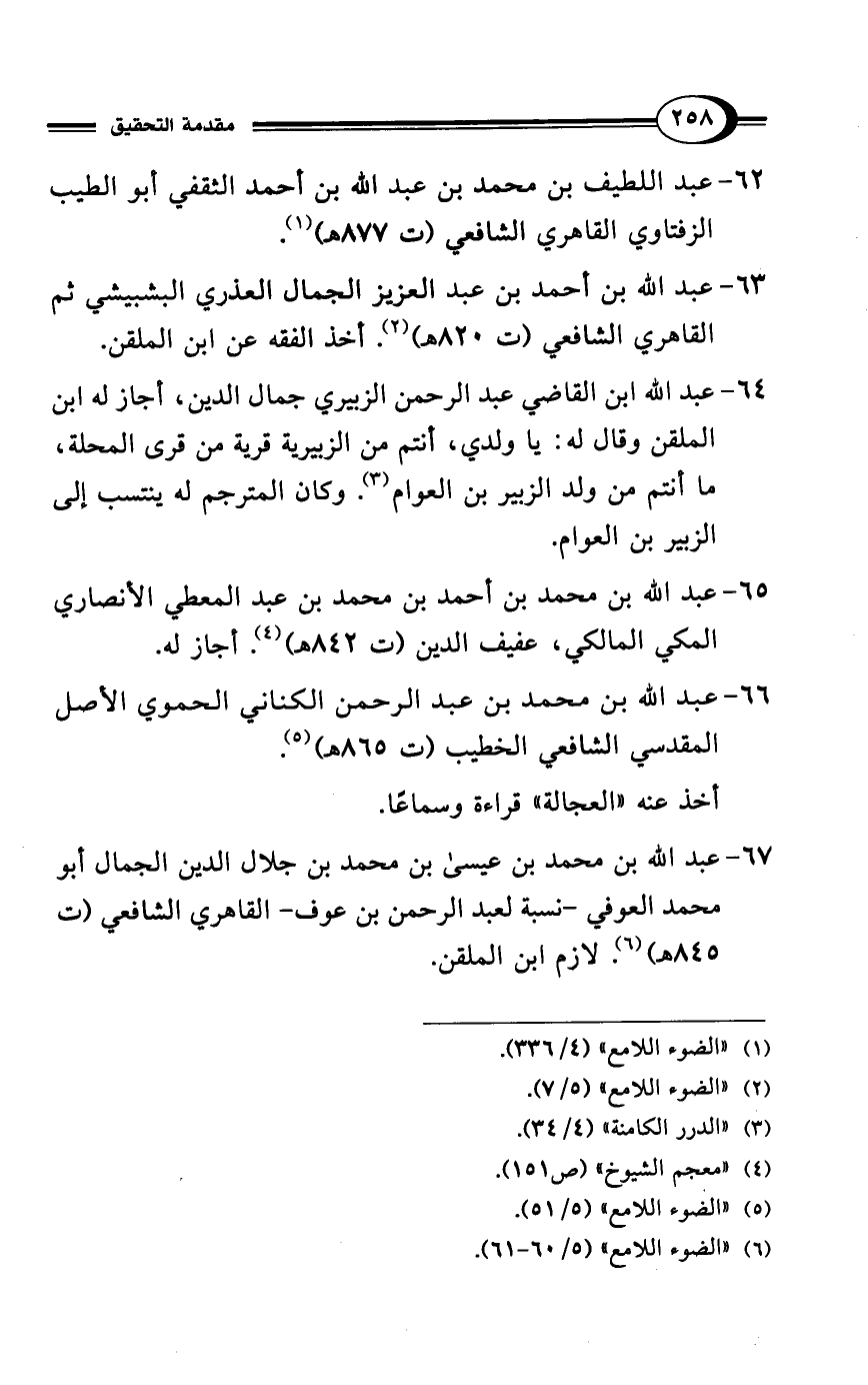 66 - عبد الله بن محمد بن عبد الرحمن الكنانى الحموي الأصل المقدسي الشافعي الخطيب (ت 865 هـ) (¬5). أخذ عنه "العجالة" قراءة وسماعًا.