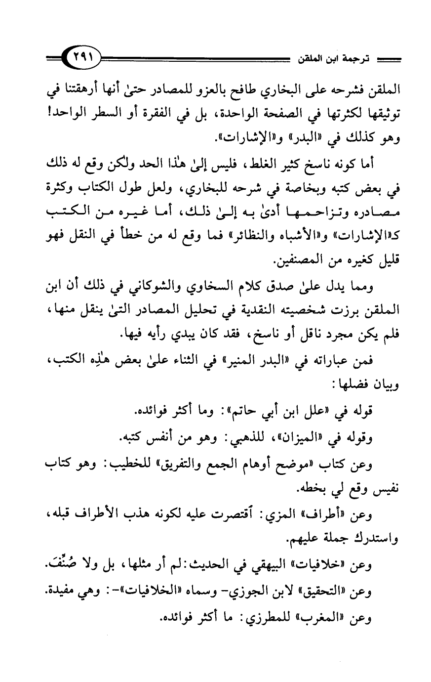 فمن عباراته في "البدر المنير" في الثناء على بعض هذِه الكتب، وبيان فضلها: