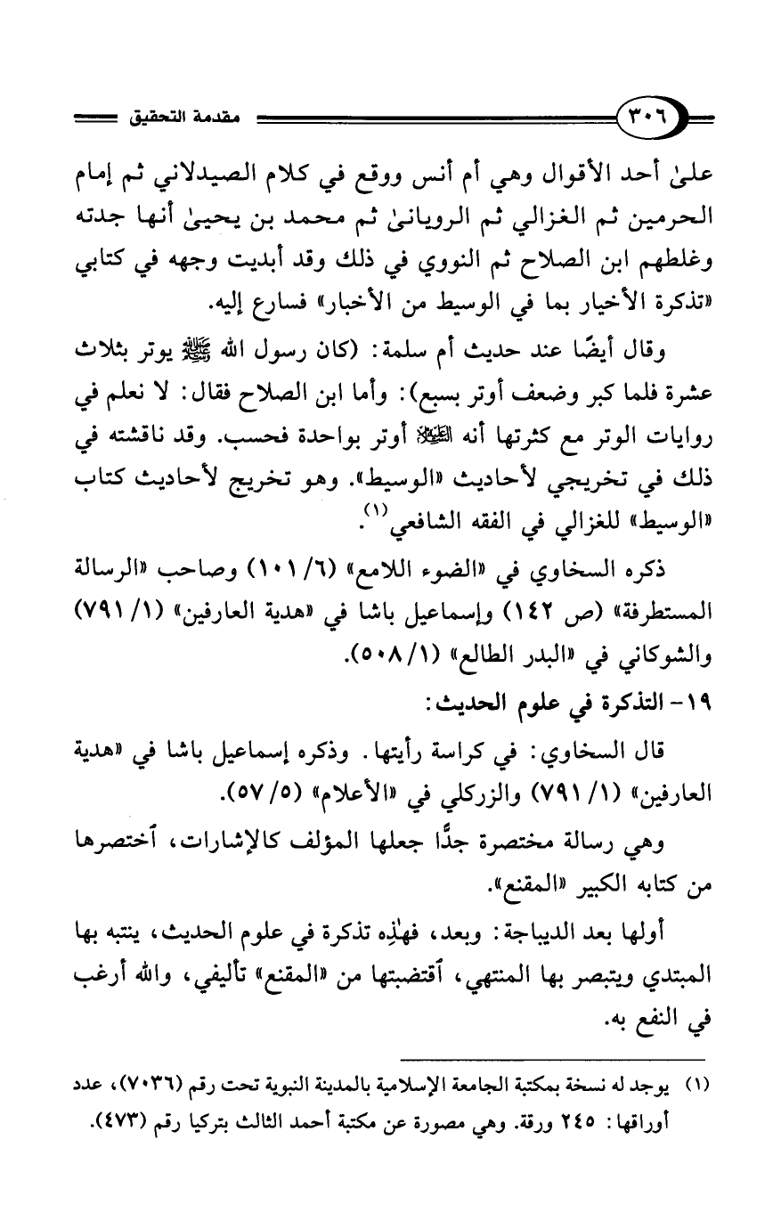 وقال أيضًا عند حديث أم سلمة: (كان رسول الله - صلى الله عليه وسلم - يوتر بثلاث عشرة فلما كبر وضعف أوتر بسبع): وأما ابن الصلاح فقال: لا نعلم في روايات الوتر مع كثرتها أنه -عليه السلام- أوتر بواحدة فحسب. وقد ناقشته في ذلك في تخريجي لأحاديث "الوسيط". وهو تخريج لأحاديث كتاب "الوسيط" للغزالي في الفقه الشافعي (¬1).