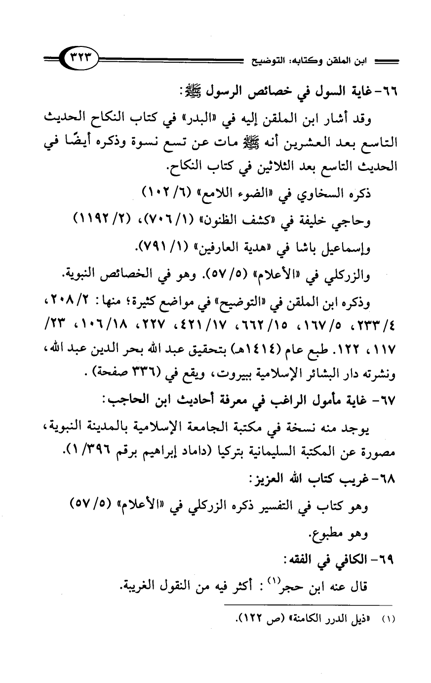 وذكره ابن الملقن في "التوضيح" في مواضع كثيرة، منها: 2/ 208، 4/ 233، 15/ 167، 15/ 662، 17/ 421، 227، 18/ 106، 23/ 117، 122. طبع عام (1414 هـ) بتحقيق عبد الله بحر الدين عبد الله، ونشرته دار البشائر الإسلامية ببيروت، ويقع في (336 صفحة).