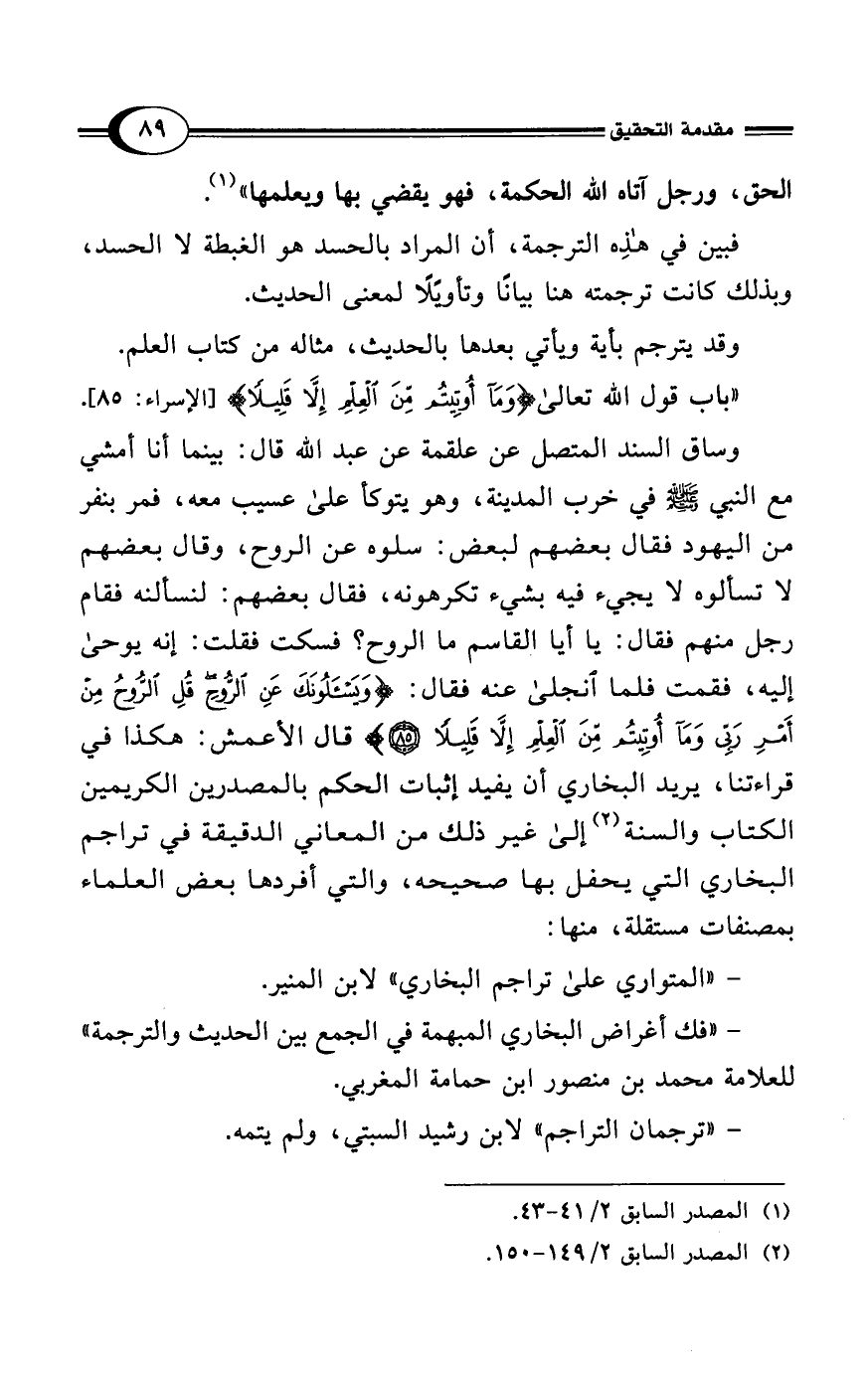 وساق السند المتصل عن علقمة عن عبد الله قال: بينما أنا أمشي مع النبي - صلى الله عليه وسلم - في خرب المدينة، وهو يتوكأ على عسيب معه، فمر بنفر من اليهود فقال بعضهم لبعض: سلوه عن الروح، وقال بعضهم لا تسألوه لا يجيء فيه بشيء تكرهونه، فقال بعضهم: لنسألنه فقام رجل منهم فقال: يا أبا القاسم ما الروح؟ فسكت فقلت: إنه يوحى إليه، فقمت فلما انجلى عنه فقال: {وَيَسْأَلُونَكَ عَنِ الرُّوحِ قُلِ الرُّوحُ مِنْ أَمْرِ رَبِّي وَمَا أُوتِيتُمْ مِنَ الْعِلْمِ إِلَّا قَلِيلًا} [الإسراء: 85] قال الأعمش: هكذا فى قراءتنا، يريد البخاري أن يفيد إثبات الحكم بالمصدرين الكريمين الكتاب والسنة (¬2) إلى غير ذلك من المعاني الدقيقة في تراجم البخاري التي يحفل بها صحيحه، والتي أفردها بعض العلماء بمصنفات مستقلة، منها: