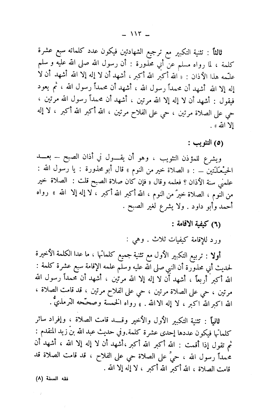 (5) التثويب: ويشرع للمؤذن التثويب، وهو أن يقول في أذان الصبح - بعد الحيعلتين -: (الصلاة خير من النوم) قال أبو محذورة: يا رسول الله: علمني سنة الاذان؟ فعلمه وقال (فإن كان صلاة الصبح قلت: الصلاة خير من النوم، الصلاة خير من النوم، الله أكبر الله أكبر، لا إله إلا الله) رواه أحمد وأبو داود.