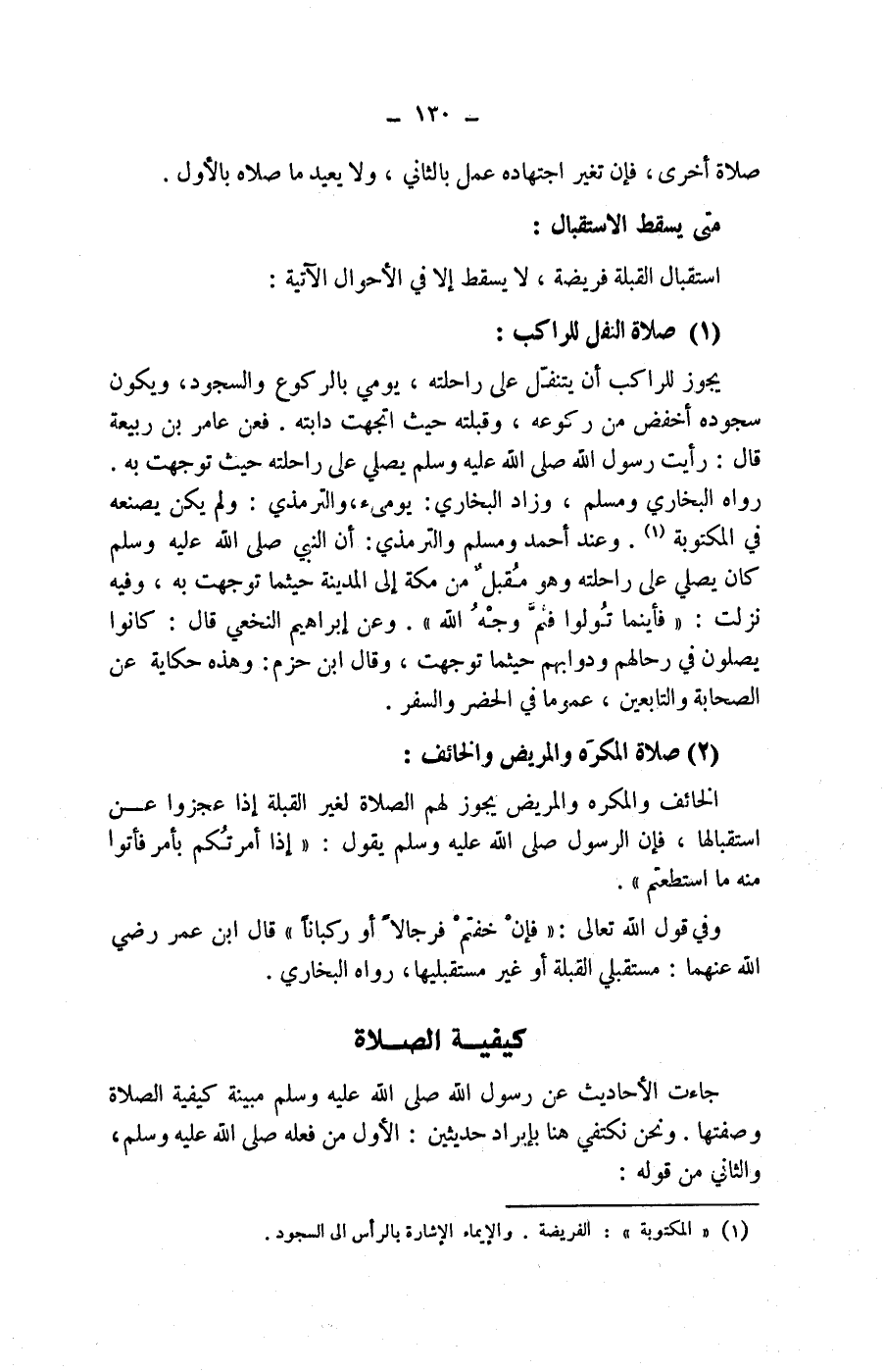 (1) صلاة النفل للراكب: يجوز للراكب أن يتنفل على راحلته، يومي بالركوع والسجود، ويكون سجوده أخفض من ركوعه، وقبلته حيث اتجهت دابته.