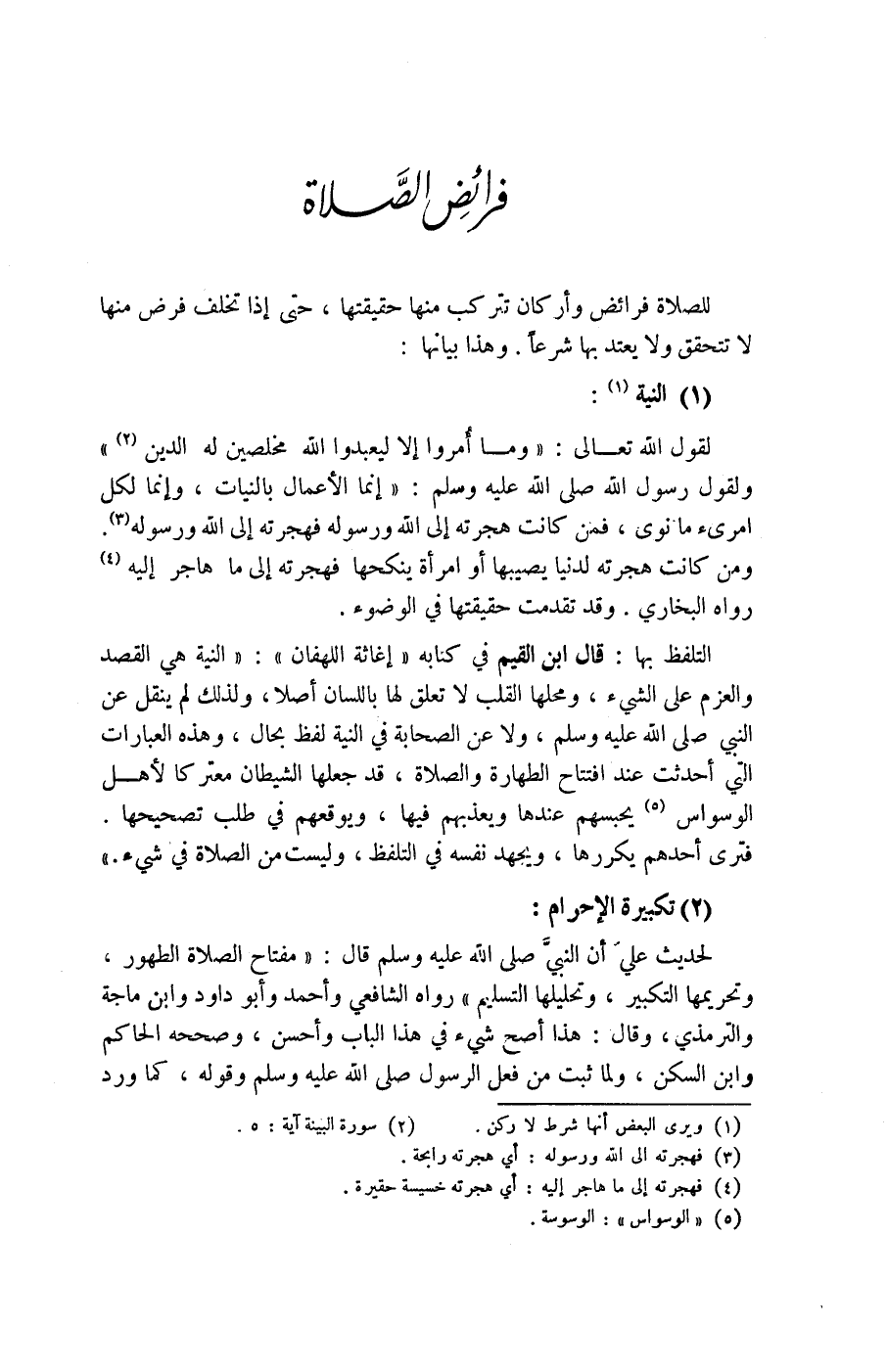 قال ابن القيم في كتابه (إعانة اللهفان) : (النية هي القصد والعزم على الشئ، ومحلها القلب لا تعلق بها باللسان أصلا، ولذلك لم ينقل عن النبي صلى الله عليه وسلم، ولا عن الصحابة في النية لفظ بحال، وهذه العبارات التي أحدثت عند افتتاح الطهارة والصلاة، قد جعلها الشيطان معتركا لاهل الوسواس (5) يحبسهم عندها ويعذبهم فيها، ويوقعهم في طلب تصحيحها.