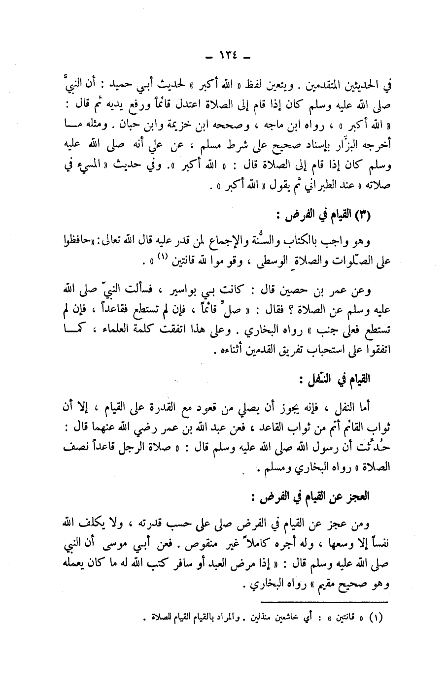 (3) القيام في الفرض: وهو واجب بالكتاب والسنة والاجماع لمن قدر عليه قال الله تعالى: (حافظوا على الصلوات والصلاة الوسطى، وقوموا لله قانتين) (1) .
